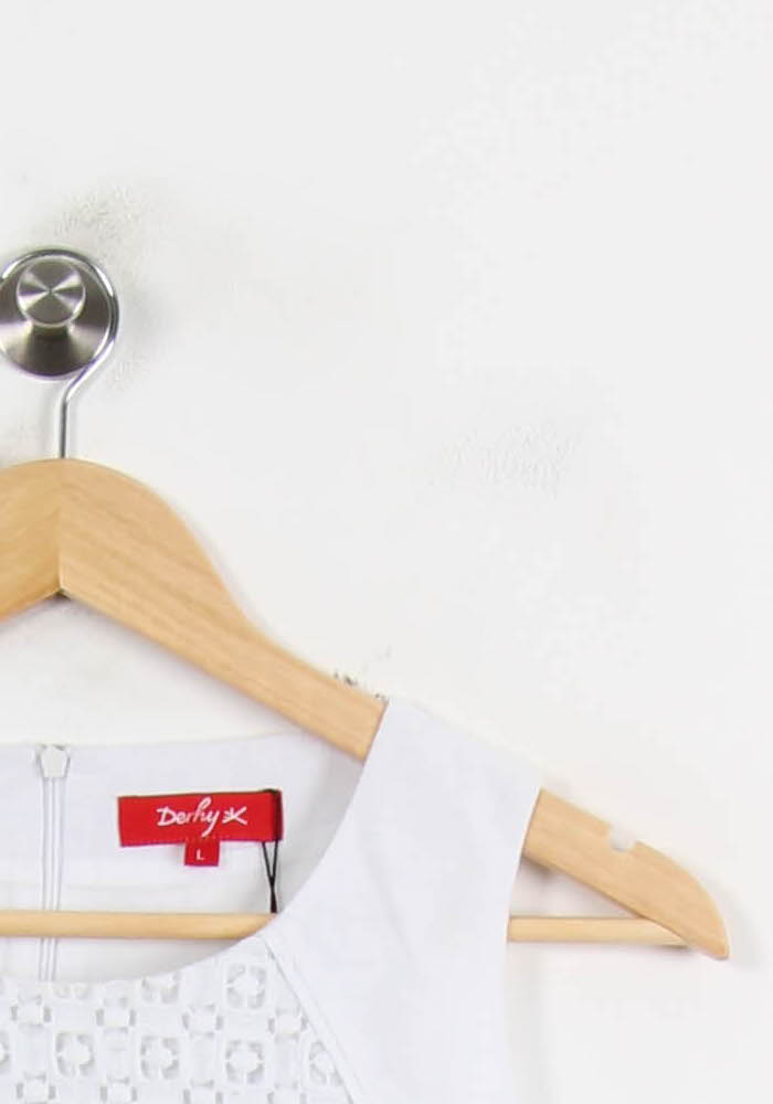 Robe sans manches blanche Derhy, taille L/40, idéale pour une allure élégante et estivale. Ce modèle se distingue par sa matière en tissu ajouré affichant deux motifs géométriques distincts, apportant à la fois raffinement et originalité. Parfaite pour une garden-party ou un cocktail en plein air.