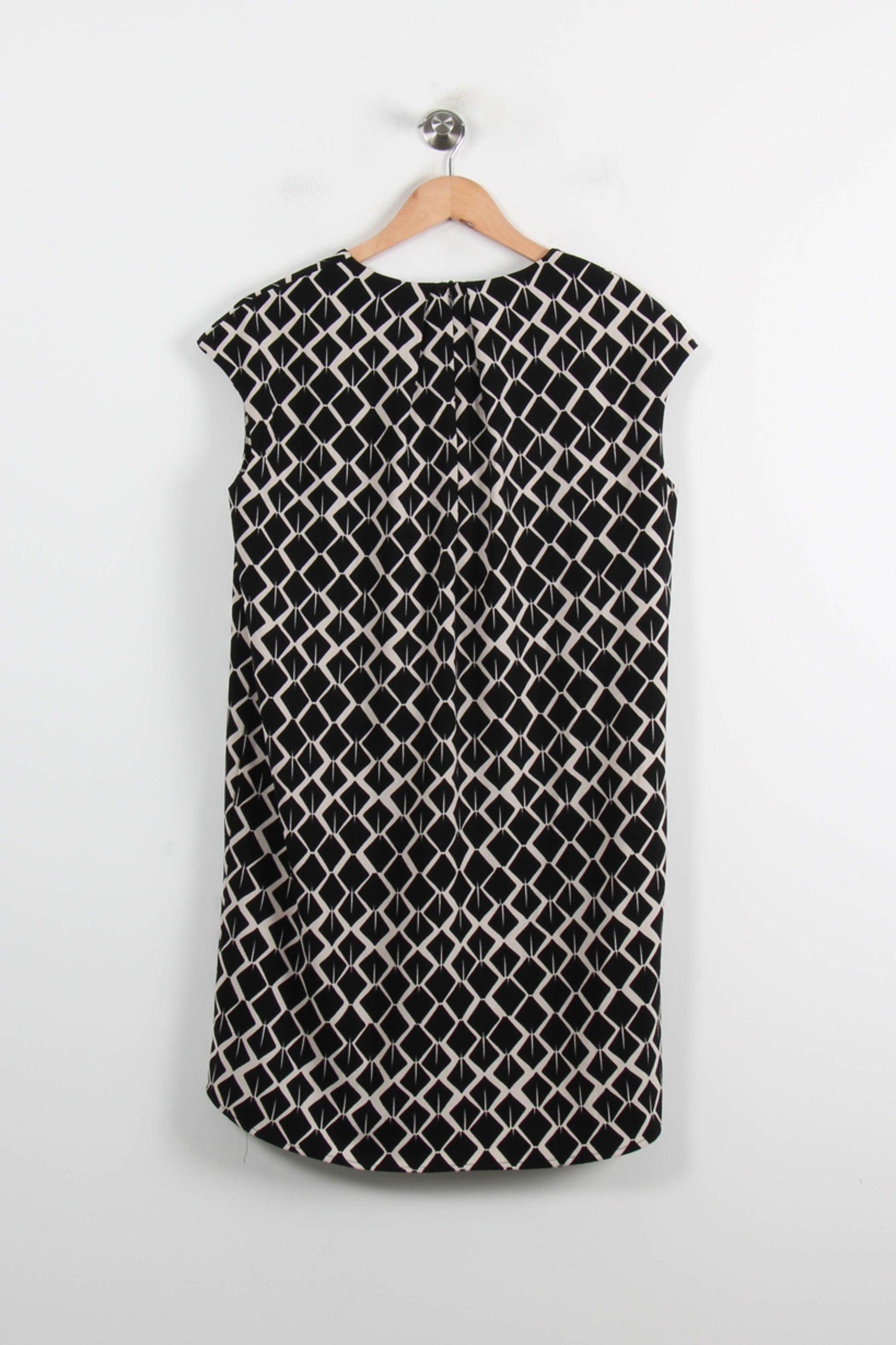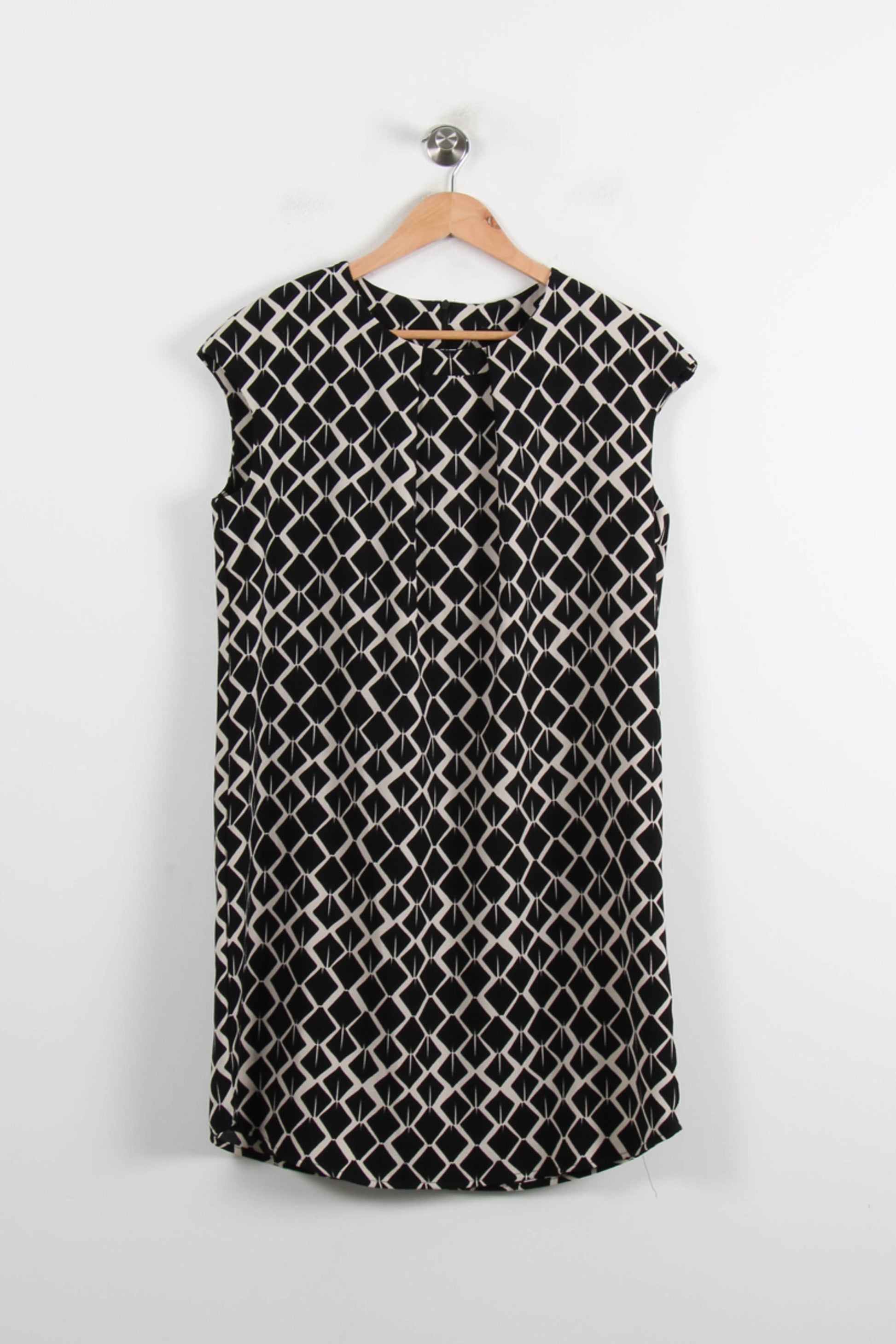 Robe noire imprimée géométrique La Fée Maraboutée, taille L/40. Confectionnée dans une matière fluide, cette robe se distingue par son motif graphique noir et blanc et ses manches courtes, apportant une note moderne et élégante à votre garde-robe. Idéale pour un déjeuner professionnel ou une sortie citadine chic.