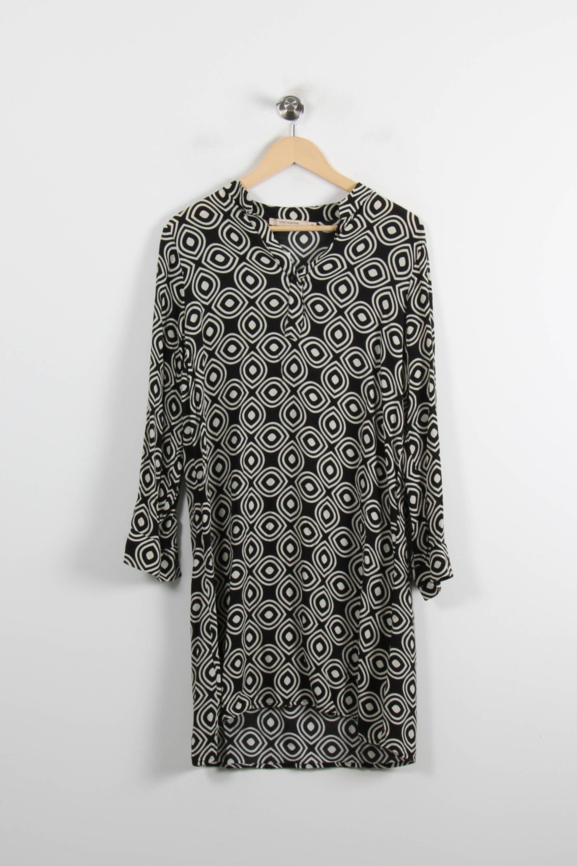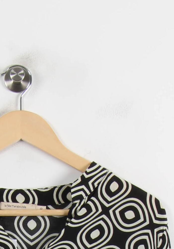 Robe noire à motifs géométriques, taille L/40, signée La Fée Maraboutée : une pièce graphique et moderne pour un style affirmé. Confectionnée dans une matière fluide et légère, cette robe se démarque par son imprimé hypnotique noir et blanc, son col légèrement fendu et ses manches longues confortables, conférant originalité et élégance à l’ensemble. Idéale pour un déjeuner en ville ou une réunion professionnelle, elle vous accompagnera avec chic en toute circonstance.