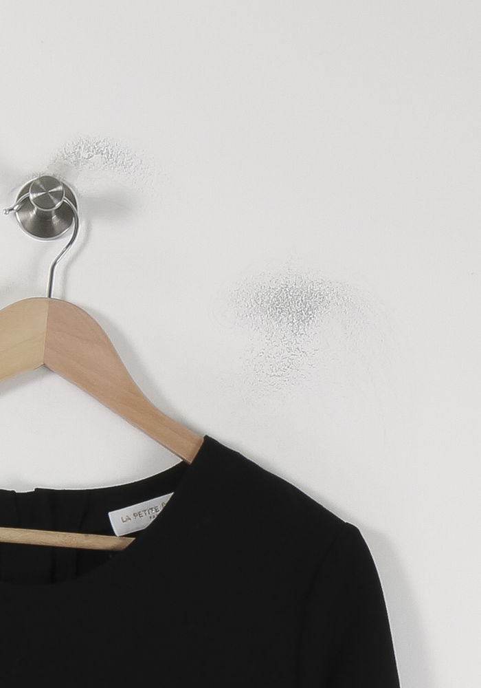 Robe noire La Petite Etoile, taille L/40, à manches 3/4 et coupe droite, idéale pour une allure élégante au quotidien. Le tissu d’aspect lisse et les deux grandes poches plaquées à rabat avec bouton sur le devant ajoutent une note à la fois sobre et moderne, offrant une finition minimaliste et raffinée. Parfaite pour un rendez-vous professionnel ou une soirée conviviale entre amis.