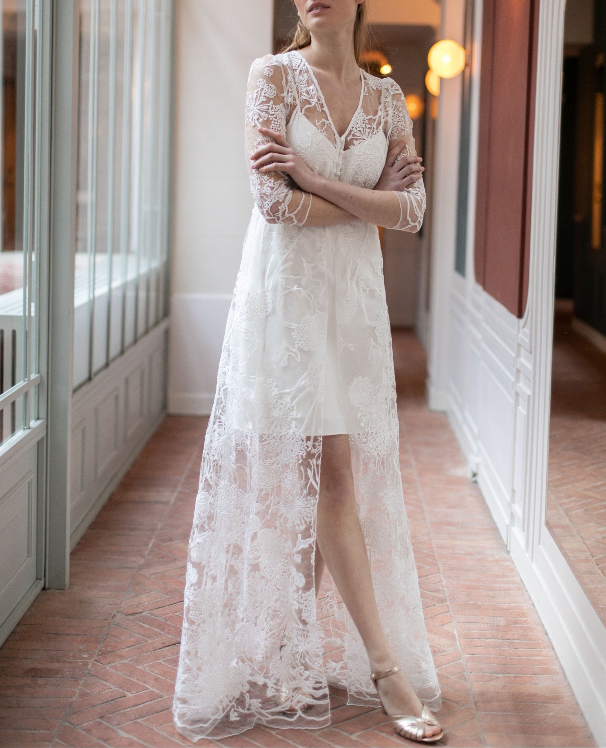 Robe longue en dentelle blanche Maison Lemoine, taille S/36. Confectionnée dans une matière délicate et transparente, elle se distingue par ses broderies florales sophistiquées et ses manches trois-quarts, apportant raffinement et modernité à la silhouette. Idéale pour une cérémonie élégante ou un événement formel.