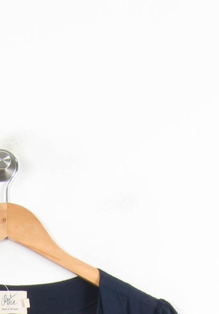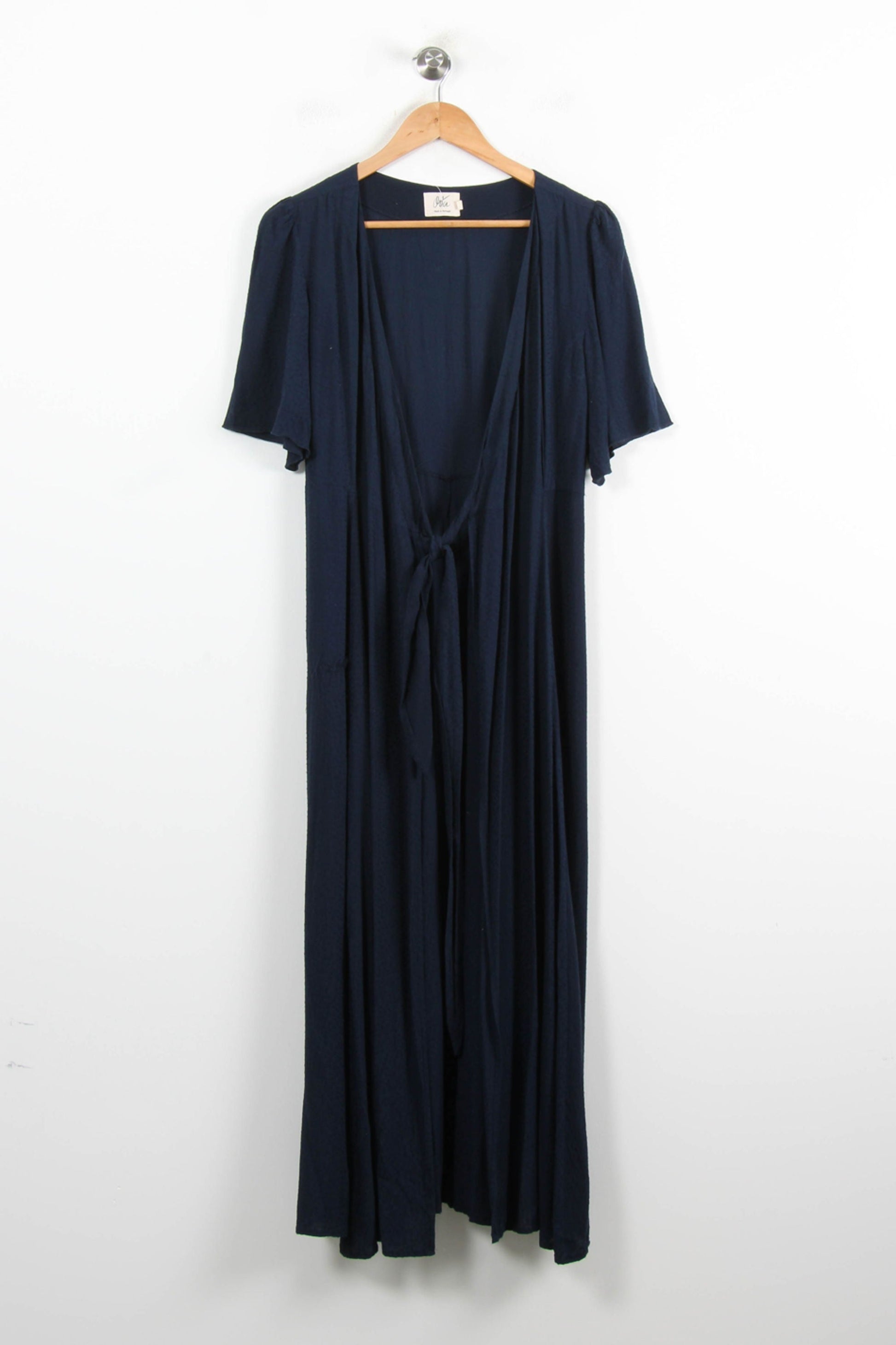Robe longue bleu marine Orta, taille M/38. Confectionnée dans une matière fluide, cette robe se distingue par ses manches courtes, son lien à nouer à la taille et sa coupe élégante qui souligne la silhouette avec raffinement. Parfaite pour un dîner estival ou une sortie élégante en journée.