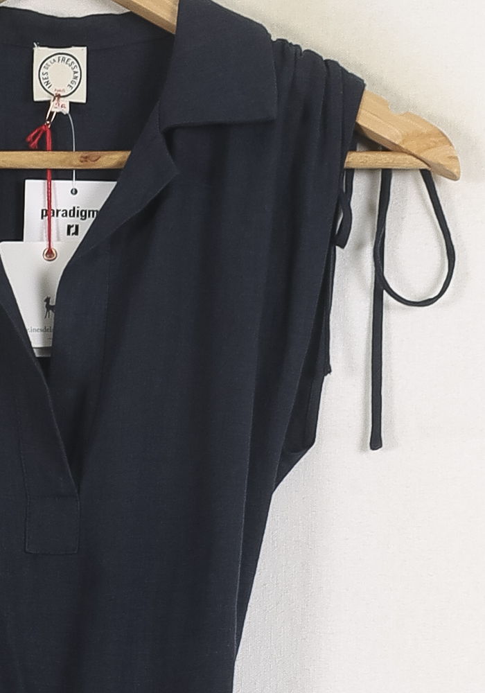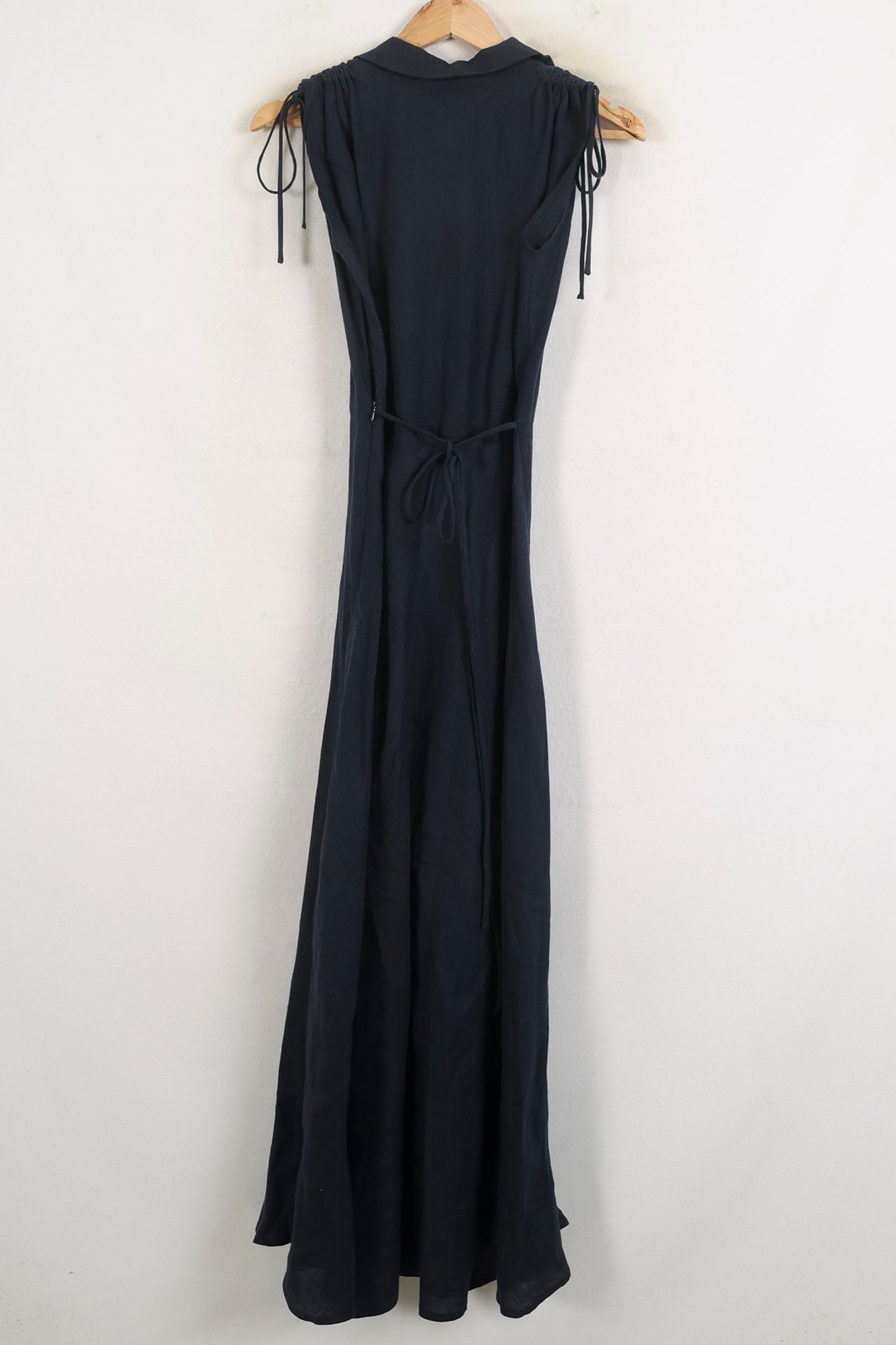 Robe longue bleu marine Ines de la Fressange Paris, taille S/36, élégante et intemporelle avec une coupe fluide et un col chemise délicat. Confectionnée dans une matière légère et subtilement texturée, cette robe se distingue par ses liens aux épaules et sa ligne évasée qui valorise la silhouette. Idéale pour une soirée estivale chic ou un événement habillé en journée.