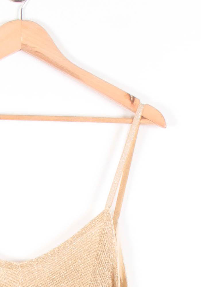 Robe longue à fines bretelles en or, taille XXL/44, signée Marina Rinaldi. Confectionnée dans une matière fluide et plissée à l’éclat subtilement irisé, cette robe se distingue par sa coupe élégante, ses jeux de texture et ses longues lignes verticales qui allongent la silhouette. Idéale pour une soirée d’été, un cocktail ou un événement festif où l’élégance discrète est de mise.