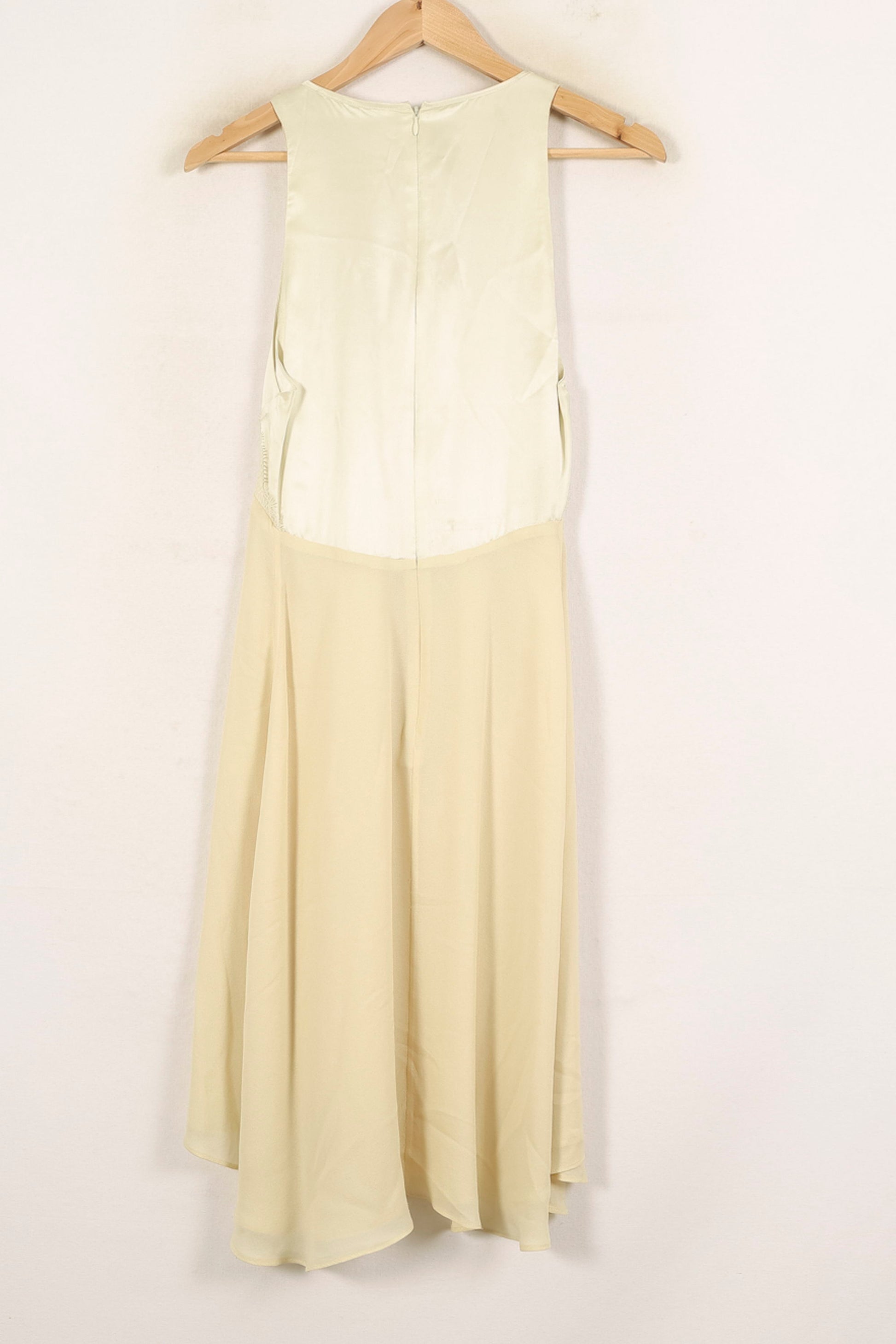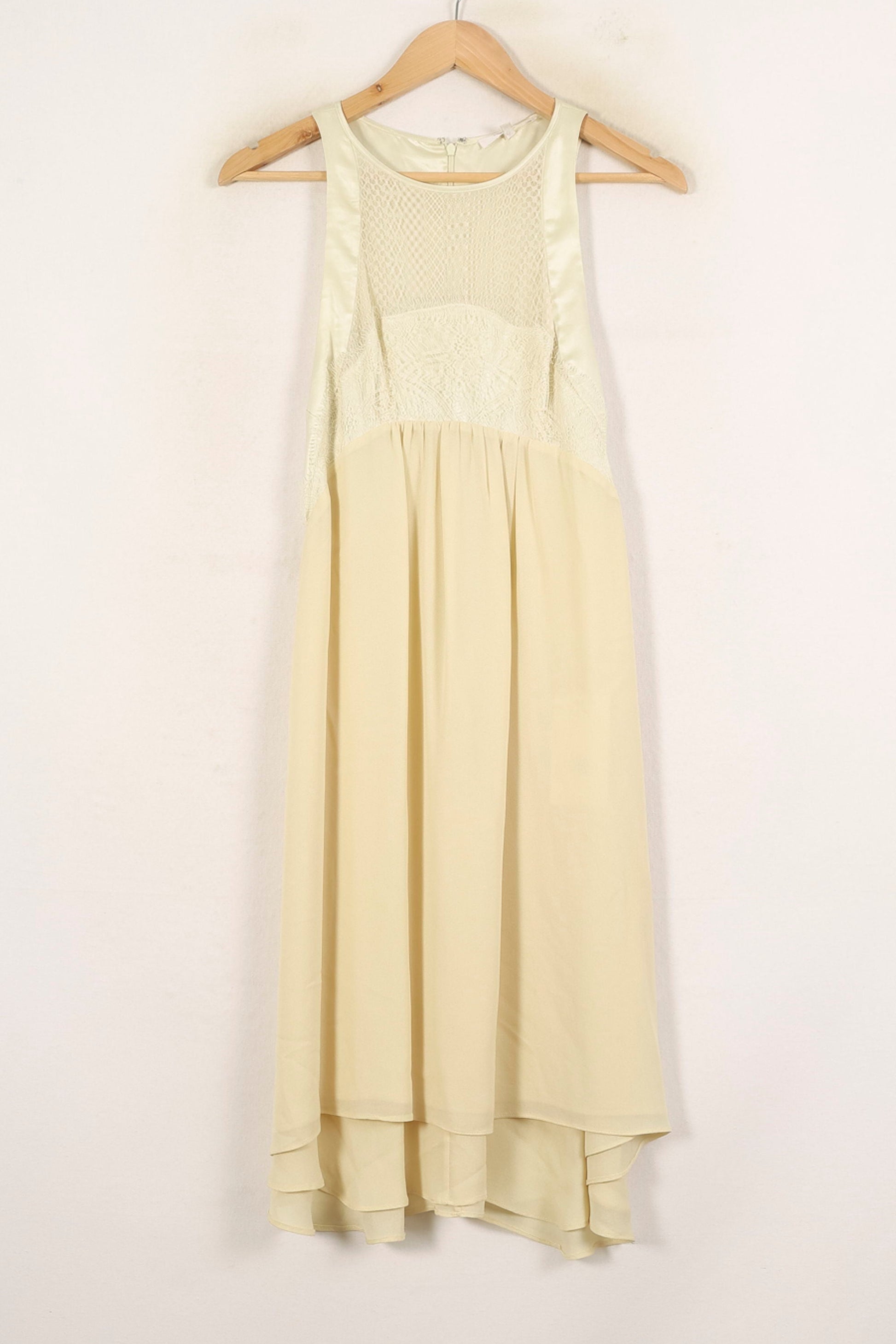 Robe jaune Vanessa Bruno taille S/36, dotée d’une coupe fluide élégante et d’un buste travaillé pour un look raffiné. Le haut en dentelle apporte une touche délicate et sophistiquée, mettant en valeur un jeu de matières subtil tandis que la partie jupe, légère et vaporeuse, accentue la finesse de l’ensemble. Parfaite pour une cérémonie estivale ou une réception en plein air, elle se distingue par sa simplicité raffinée.