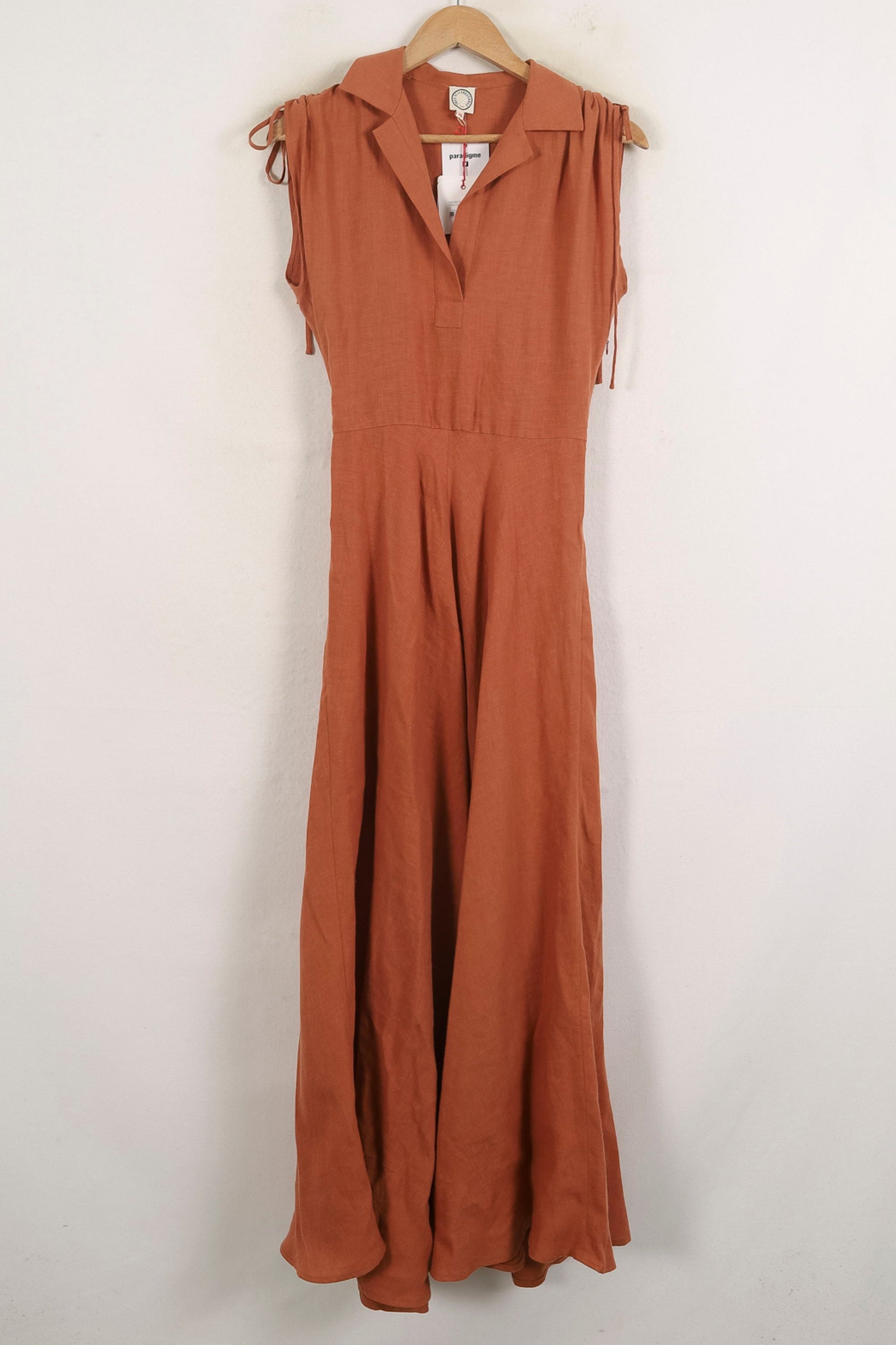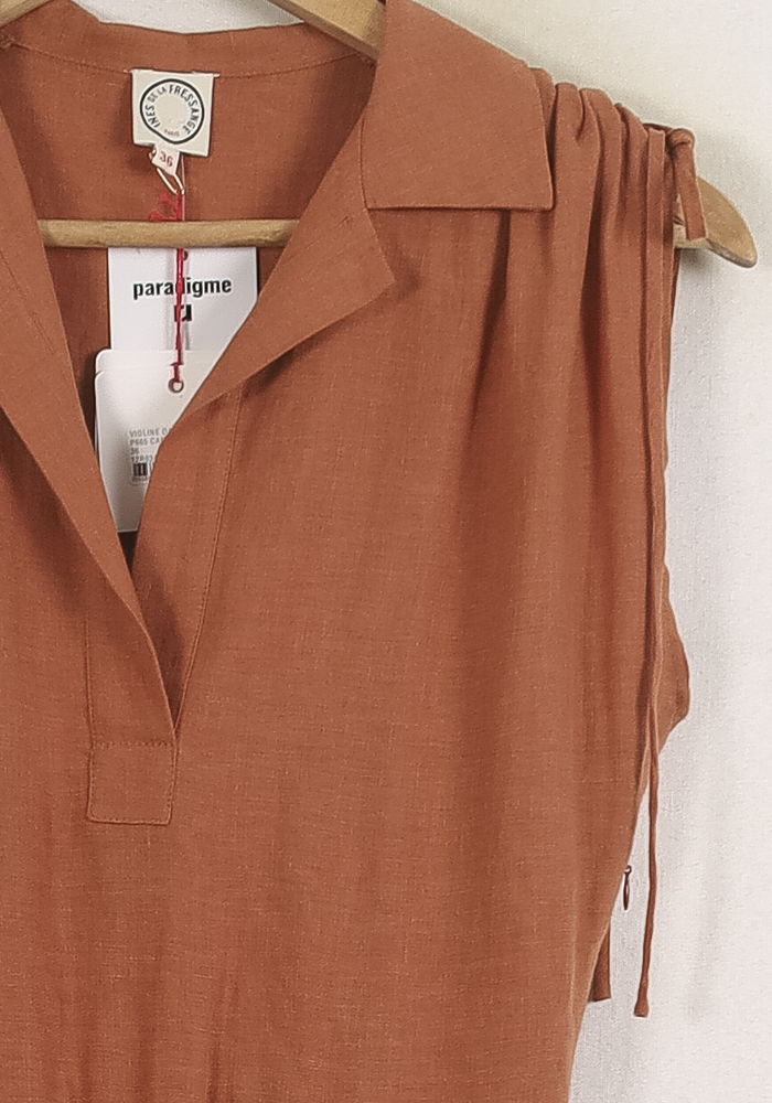 Robe longue marron sans manches, taille S/36, Ines de la Fressange Paris : une pièce élégante à la ligne fluide, dotée d’un col ouvert et d’épaulettes discrètes. La matière légère et le tombé naturel subliment la silhouette tandis que les détails épurés, comme les liens aux épaules, confèrent à cette robe un charme subtil et authentique. Parfaite pour un événement estival en journée, comme un déjeuner chic en terrasse.