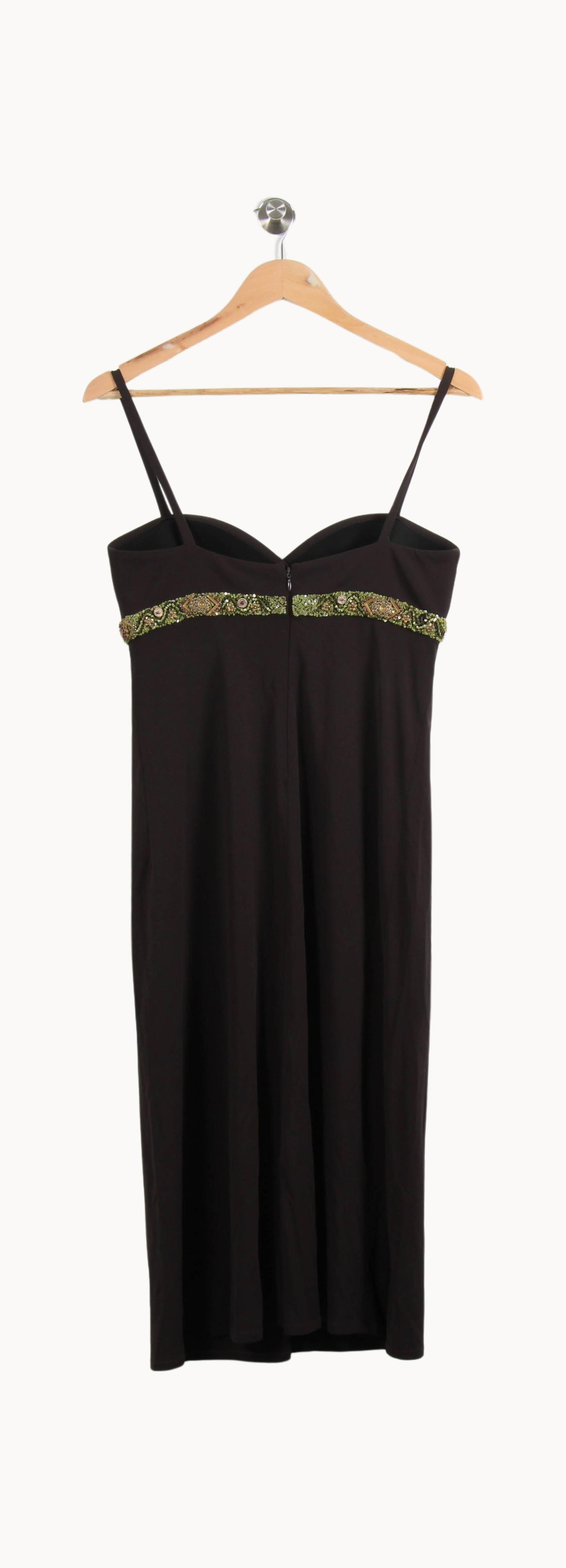 Robe Max Mara marron taille XL/42 à fines bretelles, agrémentée d'une bande ornée de broderies et perles colorées sous la poitrine. La matière fluide et le détail brodé à la taille apportent une touche de raffinement, rendant cette pièce unique et élégante. Idéale pour une soirée habillée ou un cocktail.