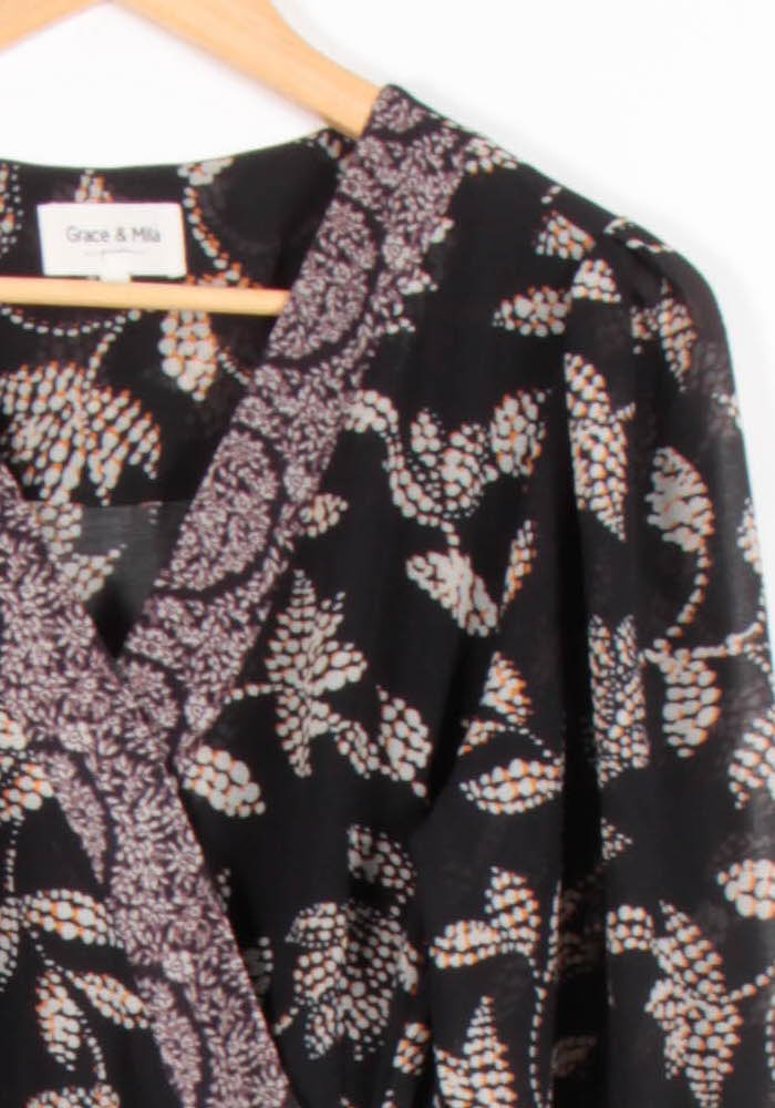 Robe longue Grace & Mila noire à motifs fleuris, taille L/40, offrant une silhouette élégante et féminine. Confectionnée dans une matière fluide et légère, cette robe présente un imprimé floral délicat et un col cache-cœur souligné par un liseré contrastant, ainsi que des manches longues aux poignets légèrement plissés, ce qui lui confère charme et originalité. Idéale pour une sortie chic entre amis ou un événement semi-formel, elle assure confort et raffinement en toute circonstance.