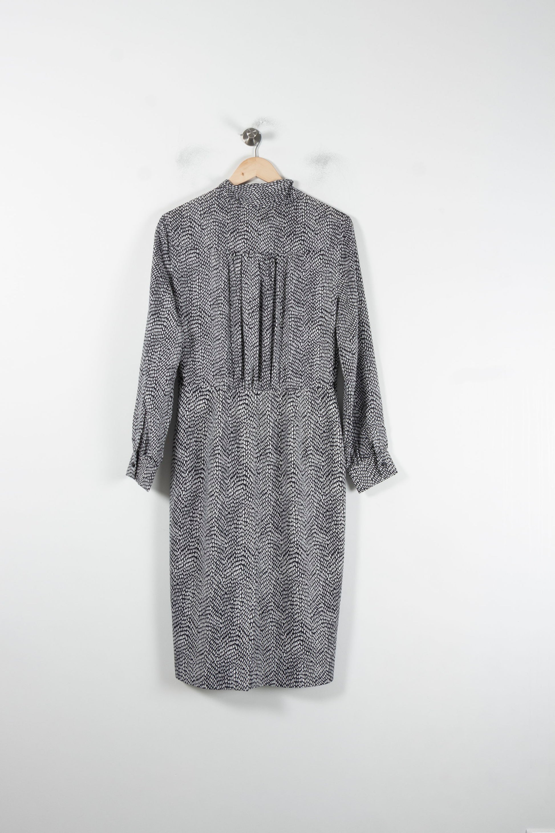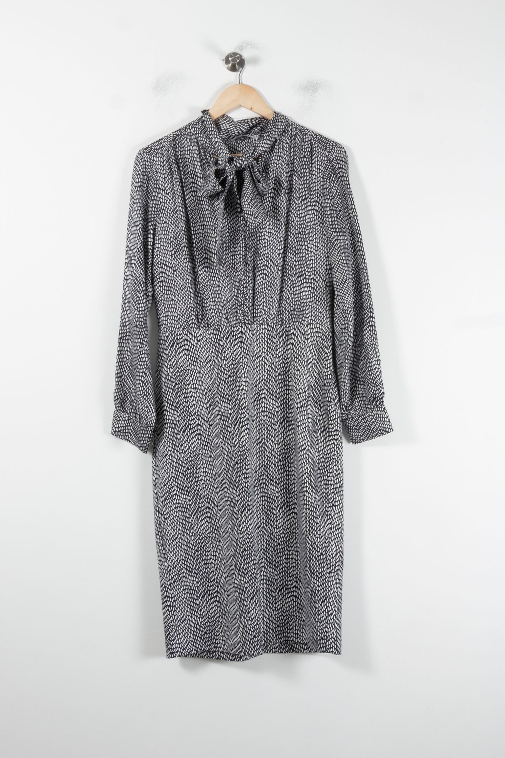Robe Max Mara noire à motif graphique, taille XL/42, parfaite incarnation de l’élégance intemporelle de la marque. Confectionnée en tissu principal 100% polyester, cette pièce se distingue par son col lavallière et ses manches longues, apportant une touche sophistiquée et raffinée à la silhouette. Idéale pour un événement professionnel ou une soirée chic, elle garantit allure et confort en toute occasion.