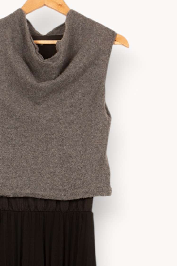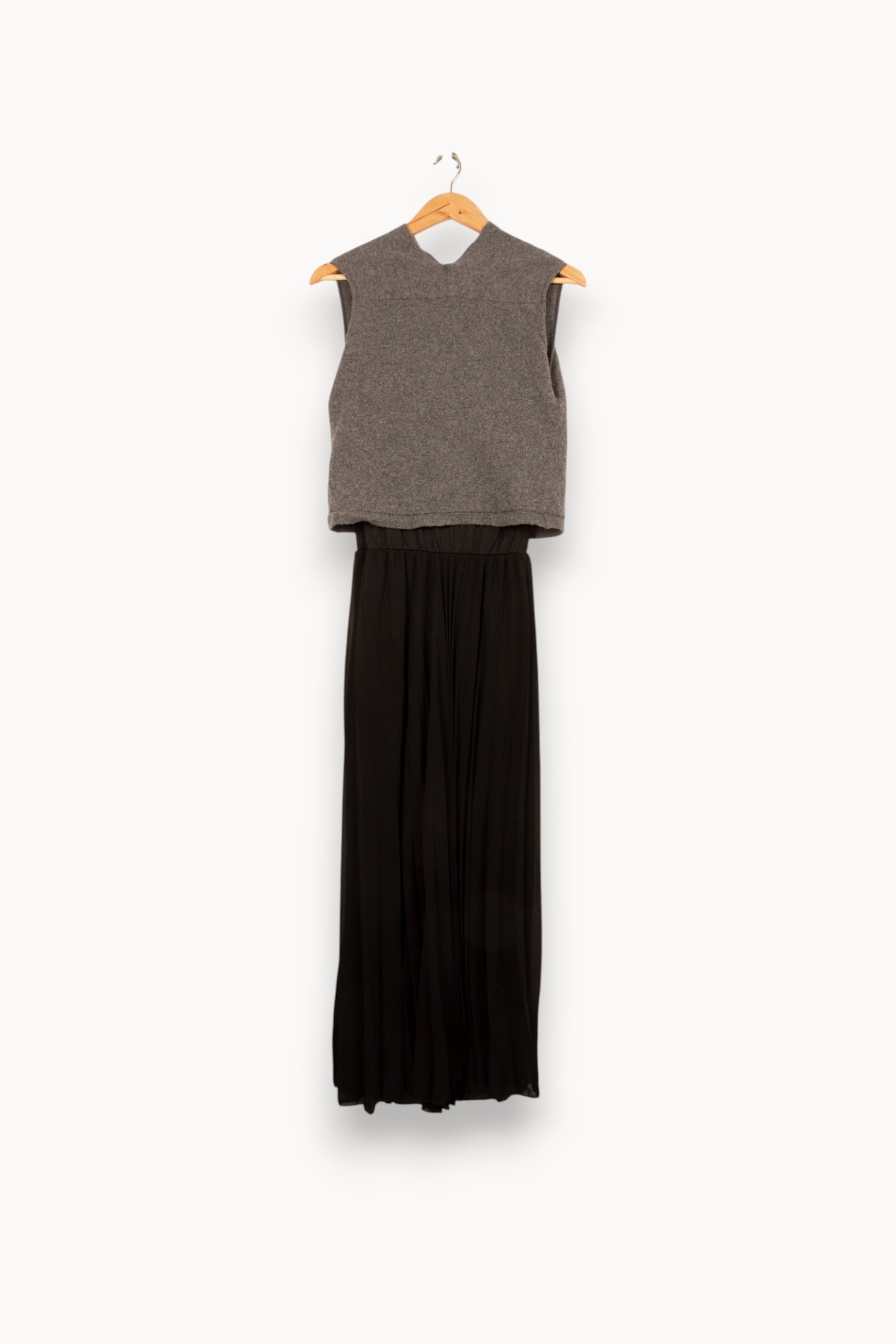 Robe longue sans manches La Fée Maraboutée, taille S/36, en deux tons gris et noir. Le haut présente une matière grise à col drapé contrastant avec la jupe longue plissée noire fluide, offrant une silhouette élégante et contemporaine. Idéale pour une soirée d’automne ou un événement raffiné, cette robe se distingue par son style moderne et confortable.