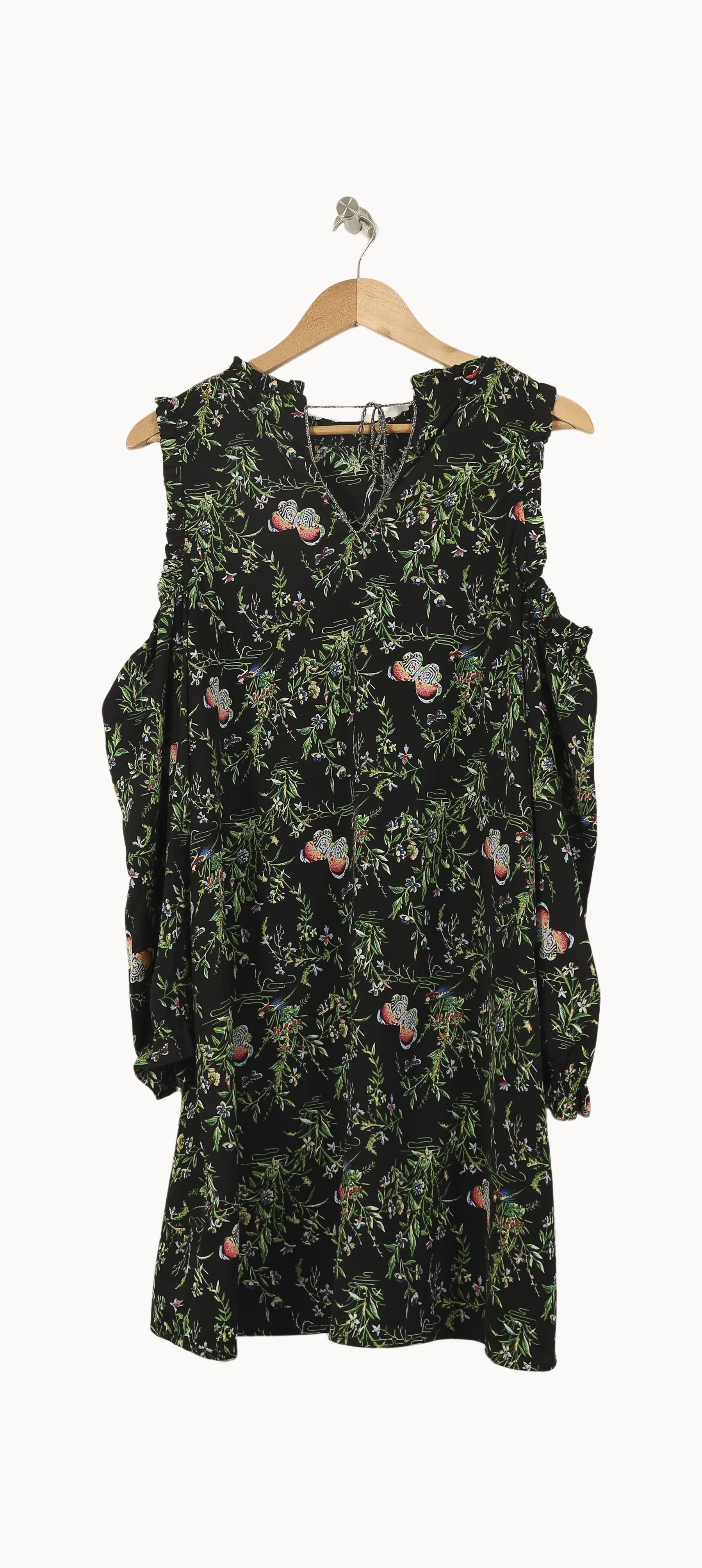 Robe multicolore Grace & Mila en taille M/38, présentant une coupe fluide et des manches longues avec volants. Confectionnée dans un tissu léger, cette robe se distingue par ses motifs floraux et papillons colorés sur fond noir, ainsi que des détails plissés et froncés qui lui confèrent une touche de romantisme unique. Idéale pour une garden party ou une sortie estivale, elle se porte aussi bien en journée qu’en soirée.