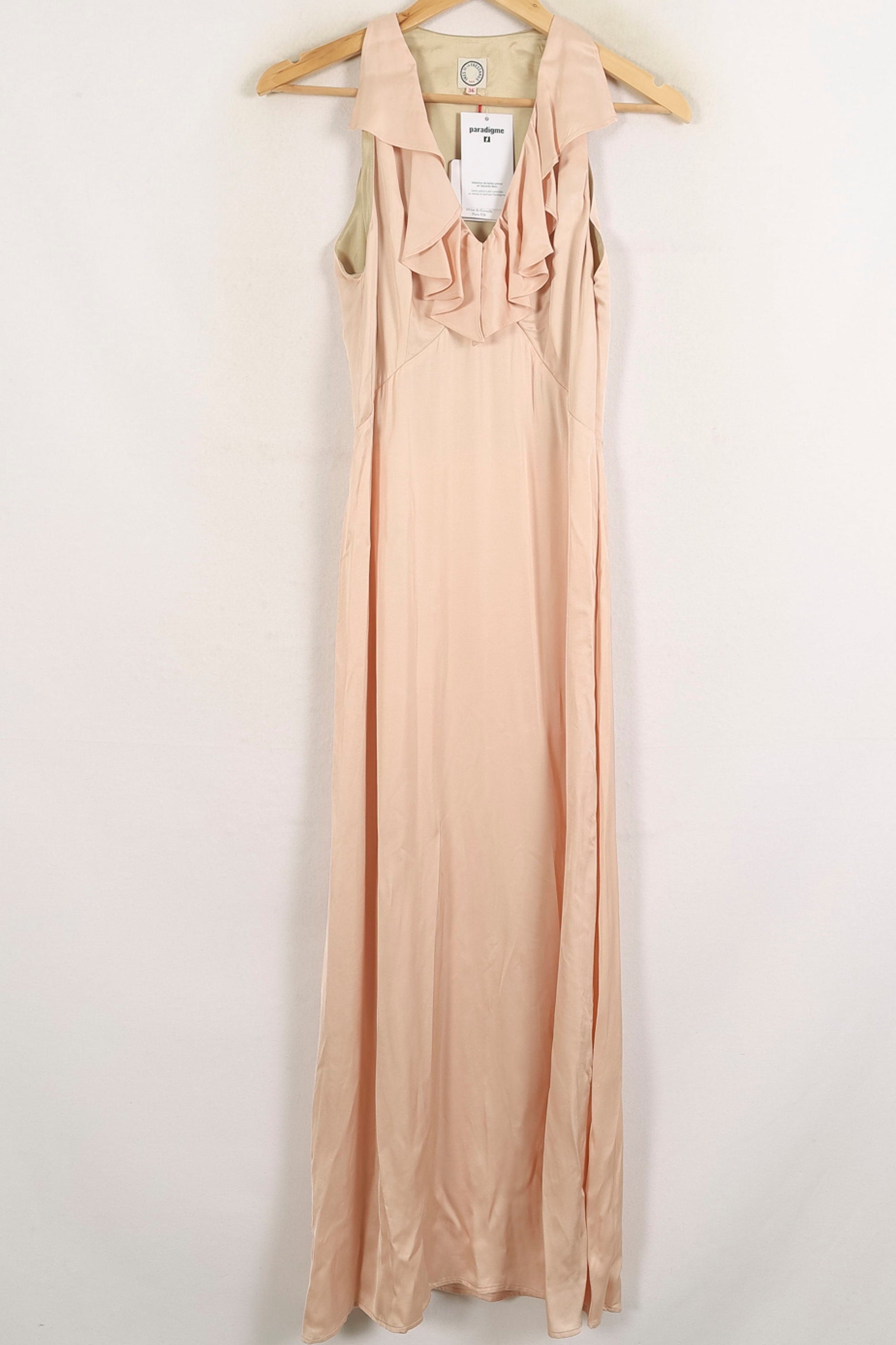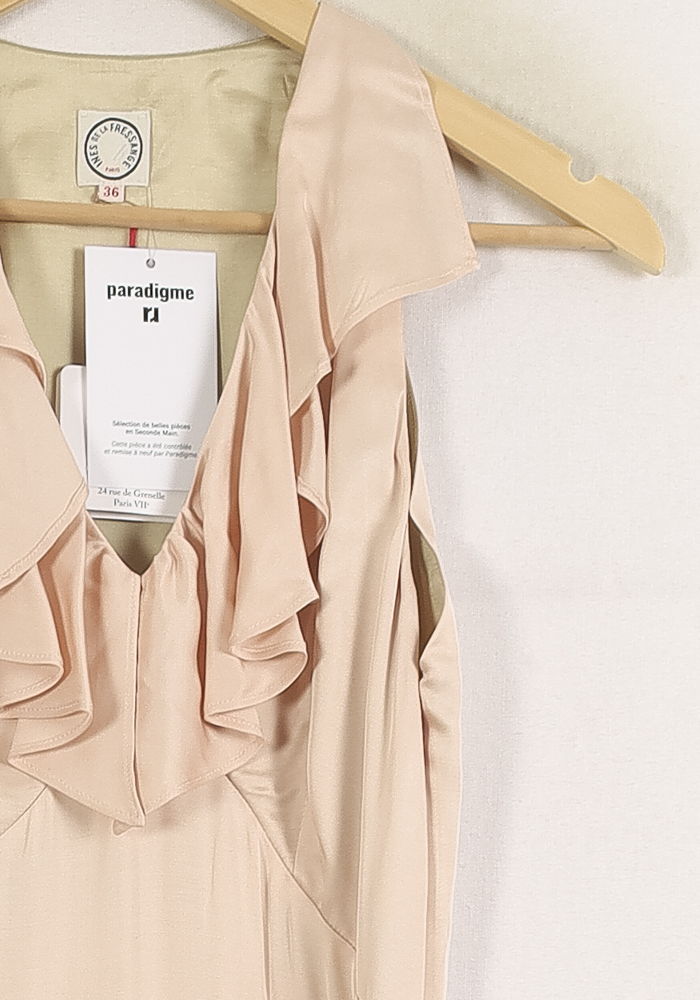 Robe longue rose en satin, modèle à volants col V, taille S/36, signée Ines de la Fressange Paris. Confectionnée dans une matière satinée lumineuse, cette robe se distingue par ses élégants volants au décolleté, apportant raffinement et féminité à la silhouette. Parfaite pour une soirée habillée ou un événement estival sophistiqué.