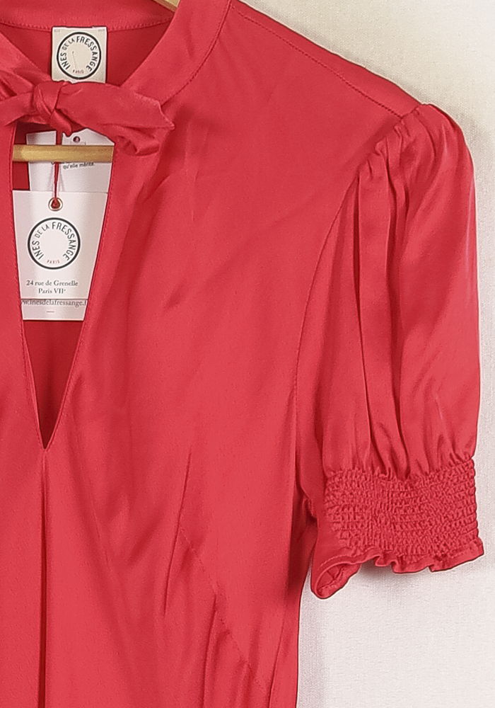 Robe longue rose Ines de la Fressange Paris, taille S/36, à manches courtes et col noué. Confectionnée dans une matière satinée, cette robe se distingue par sa coupe élégante, ses manches courtes bouffantes à smocks et son délicat nœud au col, lui offrant une allure sophistiquée et féminine. Idéale pour une réception, un cocktail ou une soirée habillée où vous souhaitez rayonner avec distinction.