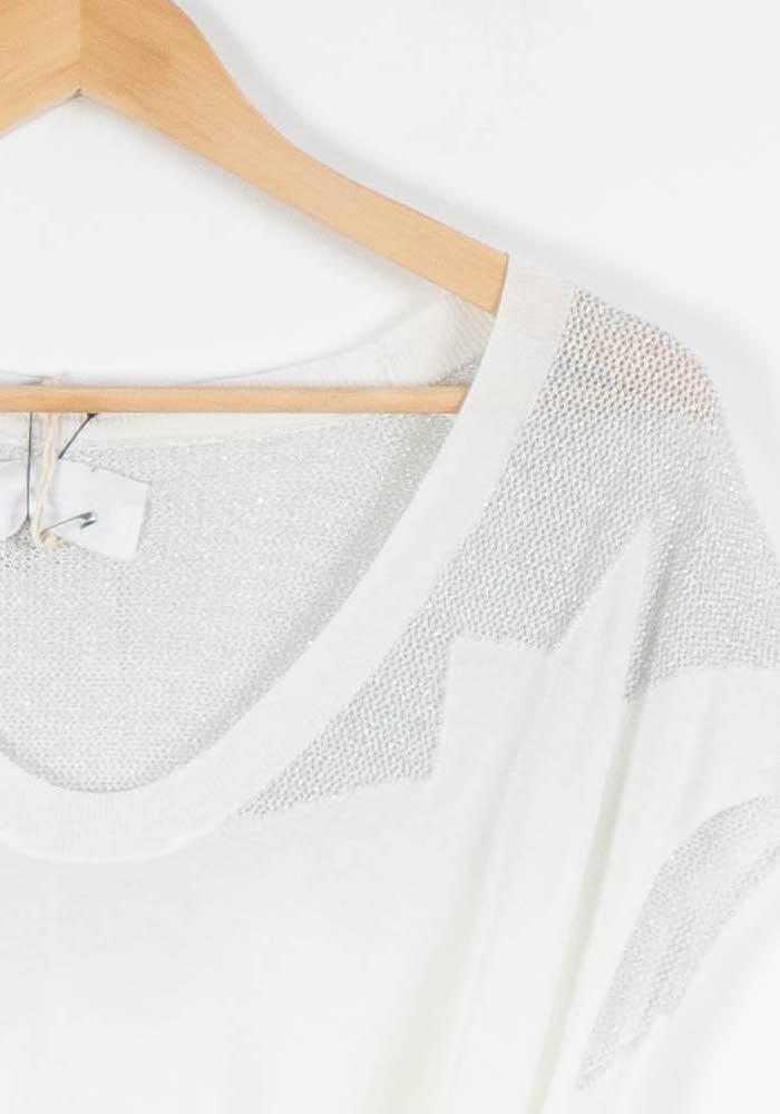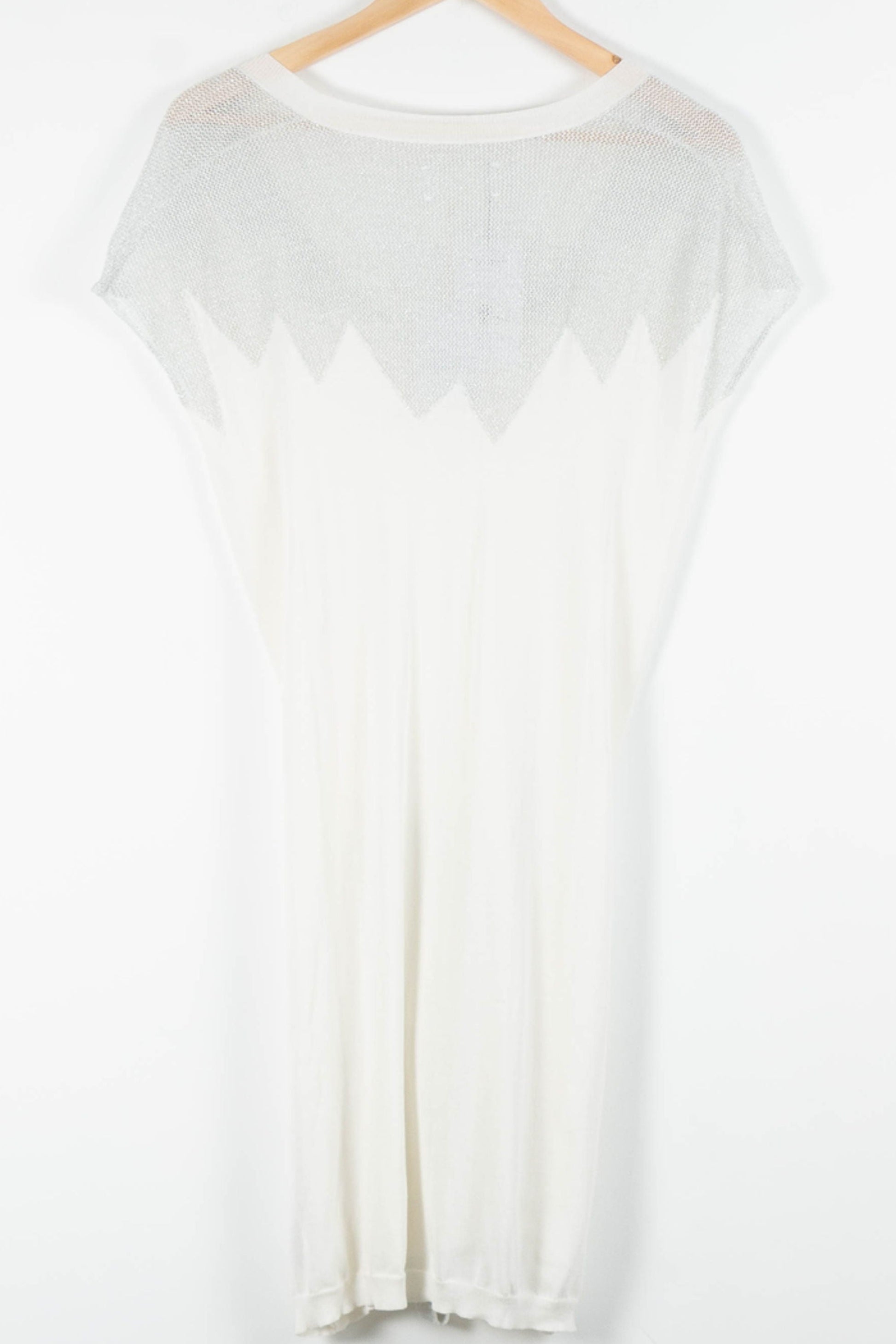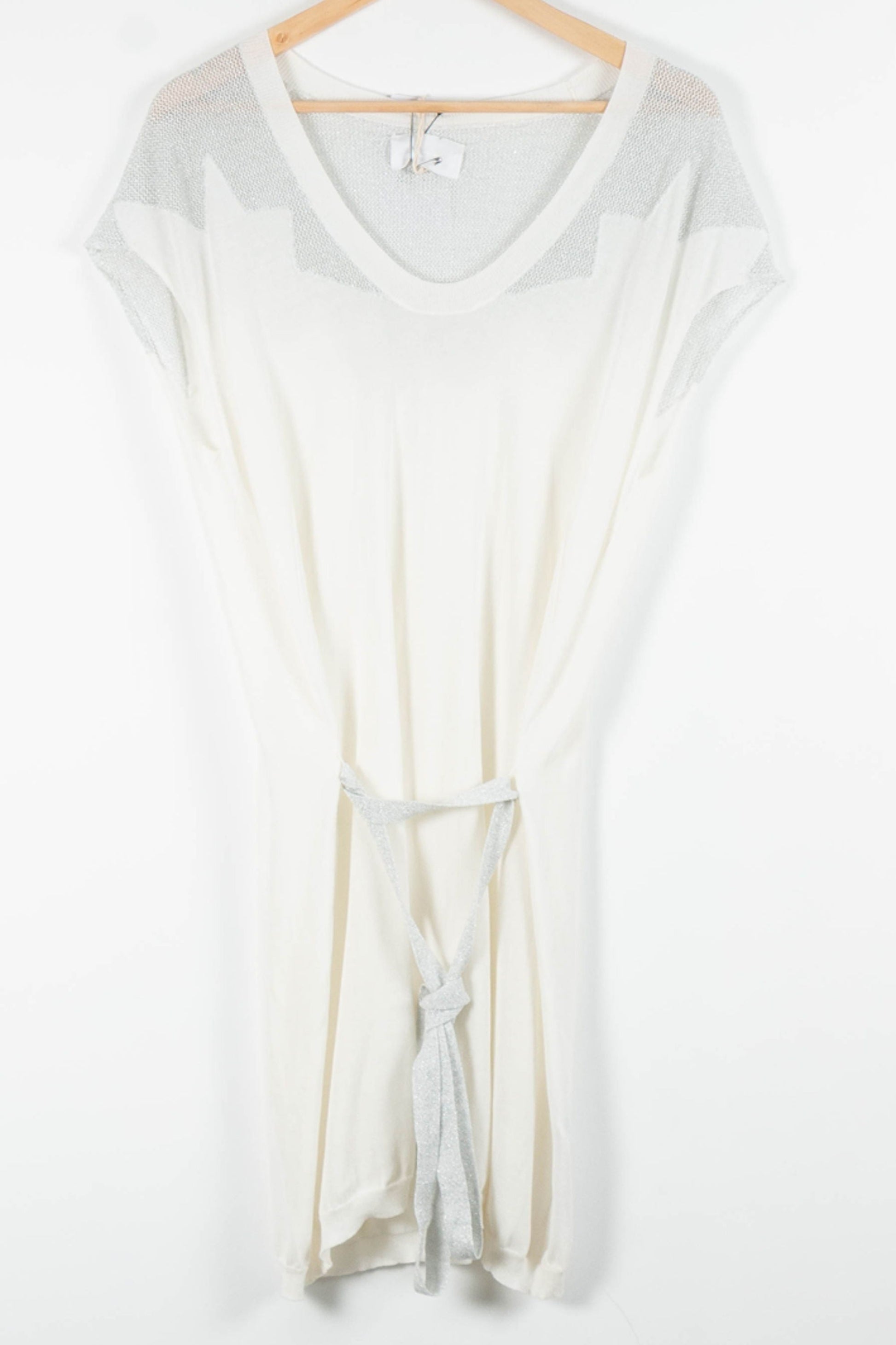 Robe blanche Zadig&Voltaire taille M/38, dotée d’un col rond et d’une ceinture à nouer assortie. La matière fluide et légère est sublimée par des détails en maille ajourée argentée sur les épaules et le haut du buste, apportant une touche originale et raffinée à la silhouette. Parfaite pour une journée estivale en ville ou un déjeuner chic en terrasse.