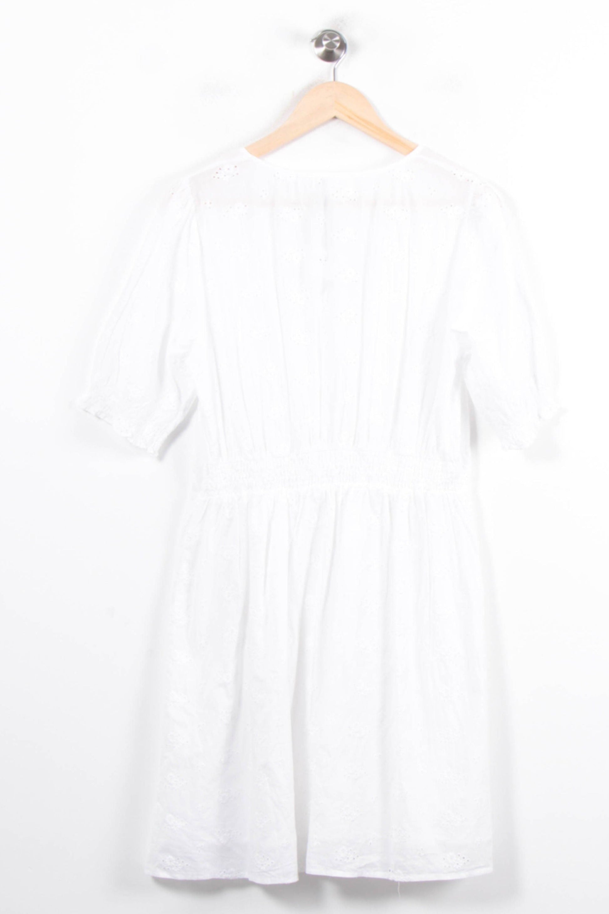 Robe blanche Grace & Mila, taille L/40, élégante et raffinée idéale pour la saison estivale. Confectionnée dans une matière légère avec broderies anglaises discrètes, elle se distingue par son encolure en V, sa coupe fluide et ses manches courtes légèrement bouffantes resserrées aux poignets. Parfaite pour une garden-party ou une cérémonie en extérieur.