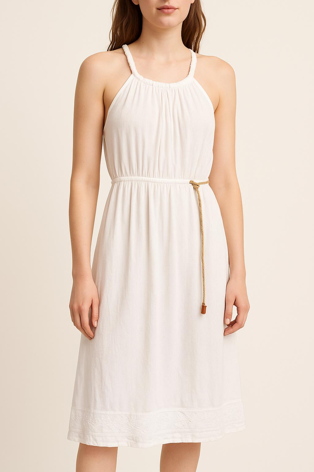 Robe blanche Zadig&Voltaire, taille M/38, affichant une coupe fluide et estivale. Confectionnée dans une matière légère, elle se distingue par ses bretelles tressées et sa ceinture fine contrastante, ainsi que par des détails de broderies délicates au bas de la robe, soulignant son allure bohème. Idéale pour une journée d’été, une balade en bord de mer ou une sortie décontractée.