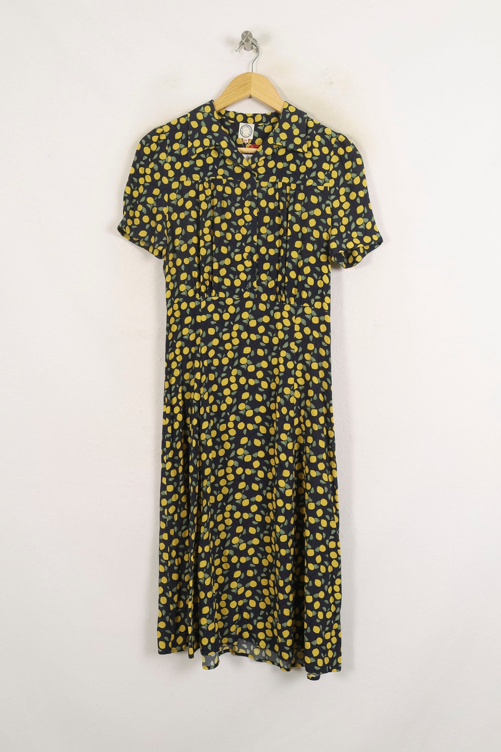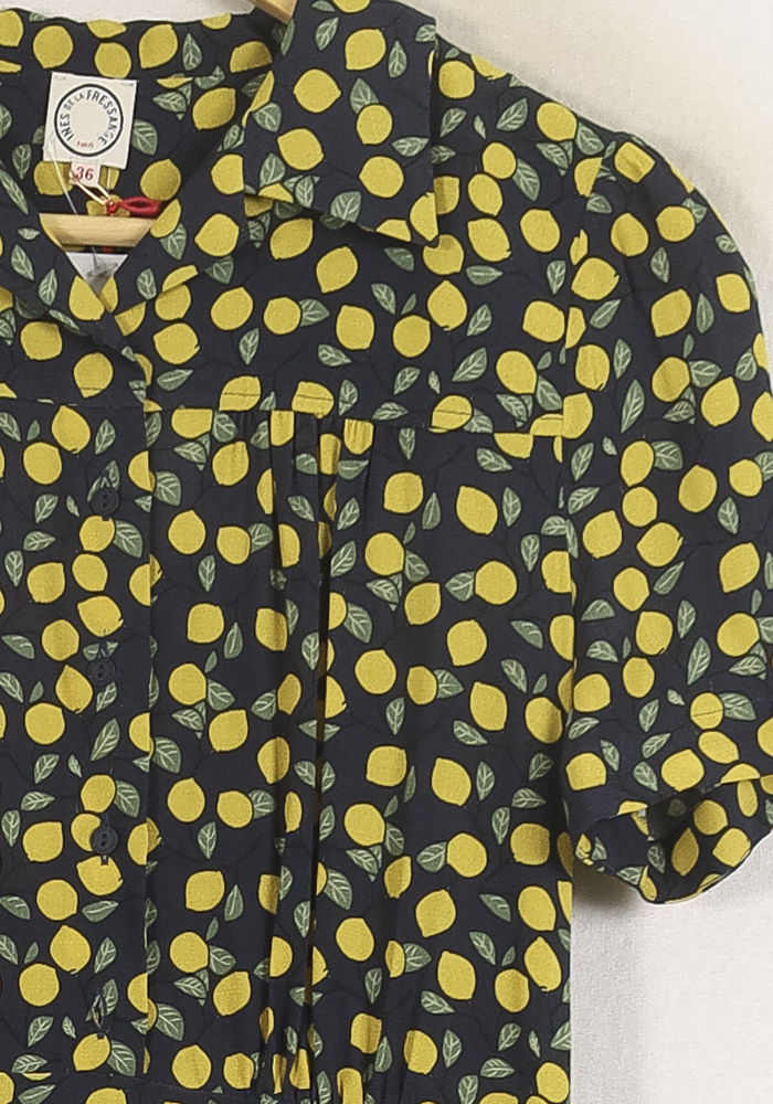 Robe bleu à motifs jaunes Ines de la Fressange Paris, taille S/36, à la coupe midi et manches courtes. Confectionnée dans un tissu fluide, cette robe se distingue par son imprimé original de petits pois jaunes et son élégant col chemisier, ajoutant une touche raffinée et pleine de caractère à la pièce. Idéale pour une journée estivale ou un brunch entre amis.