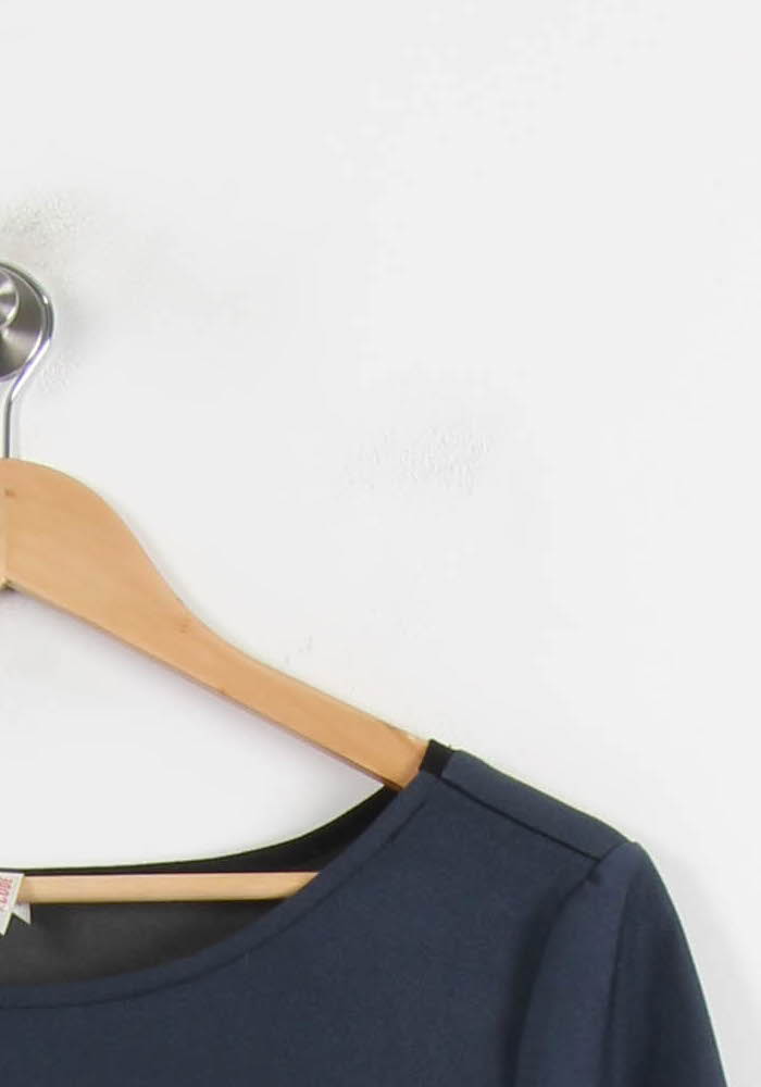 Robe bleu marine I.Code, taille L/40, à manches 3/4 et encolure ronde, offrant une allure intemporelle et élégante. Confectionnée dans une matière fluide et légèrement extensible, elle se distingue par sa coupe ajustée à la taille et sa jupe évasée, accentuant la silhouette et assurant un tombé naturel. Parfaite pour une journée de travail ou un rendez-vous formel où sobriété et raffinement sont de mise.