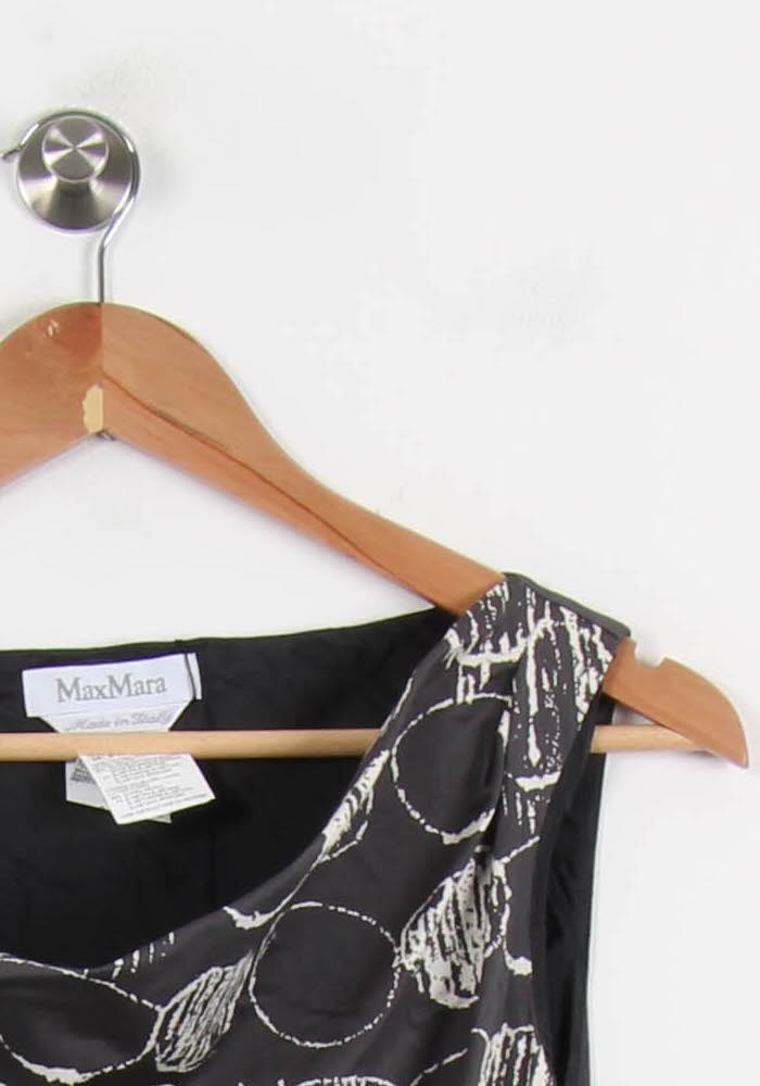 Robe Max Mara grise à imprimé graphique, taille S/36, alliant élégance et modernité. Confectionnée dans une matière fluide, elle se distingue par son encolure drapée, ses motifs circulaires contrastés et un nœud discret à la base, qui apportent une touche d’originalité et de raffinement. Idéale pour un cocktail ou une soirée estivale, cette robe fera sensation par sa singularité et son style affirmé.