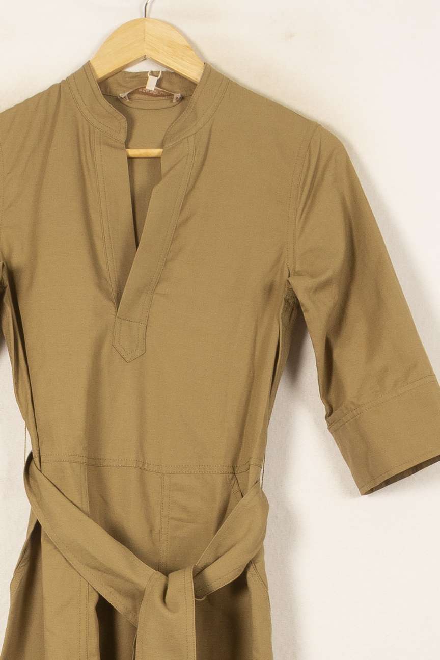 Robe Vanessa Bruno XS/34, modèle à manches 3/4 de couleur vert, coupe droite avec ceinture à nouer à la taille. Confectionnée dans une matière douce et structurée, cette robe se distingue par son col fendu soigné et ses finitions épurées, offrant une élégance discrète et un porté confortable. Idéale pour une journée au bureau ou un déjeuner en ville, elle se porte aussi bien en toute décontraction qu’avec des accessoires élégants.