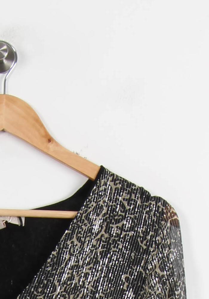 Robe Vanessa Bruno noire taille L/40, arborant un joli motif graphique et un décolleté en V. Sa matière fluide et légèrement brillante ainsi que les détails plissés sur le haut confèrent à cette pièce une allure élégante et singulière. Parfaite pour une soirée chic ou un événement habillé où vous souhaitez vous distinguer avec subtilité.