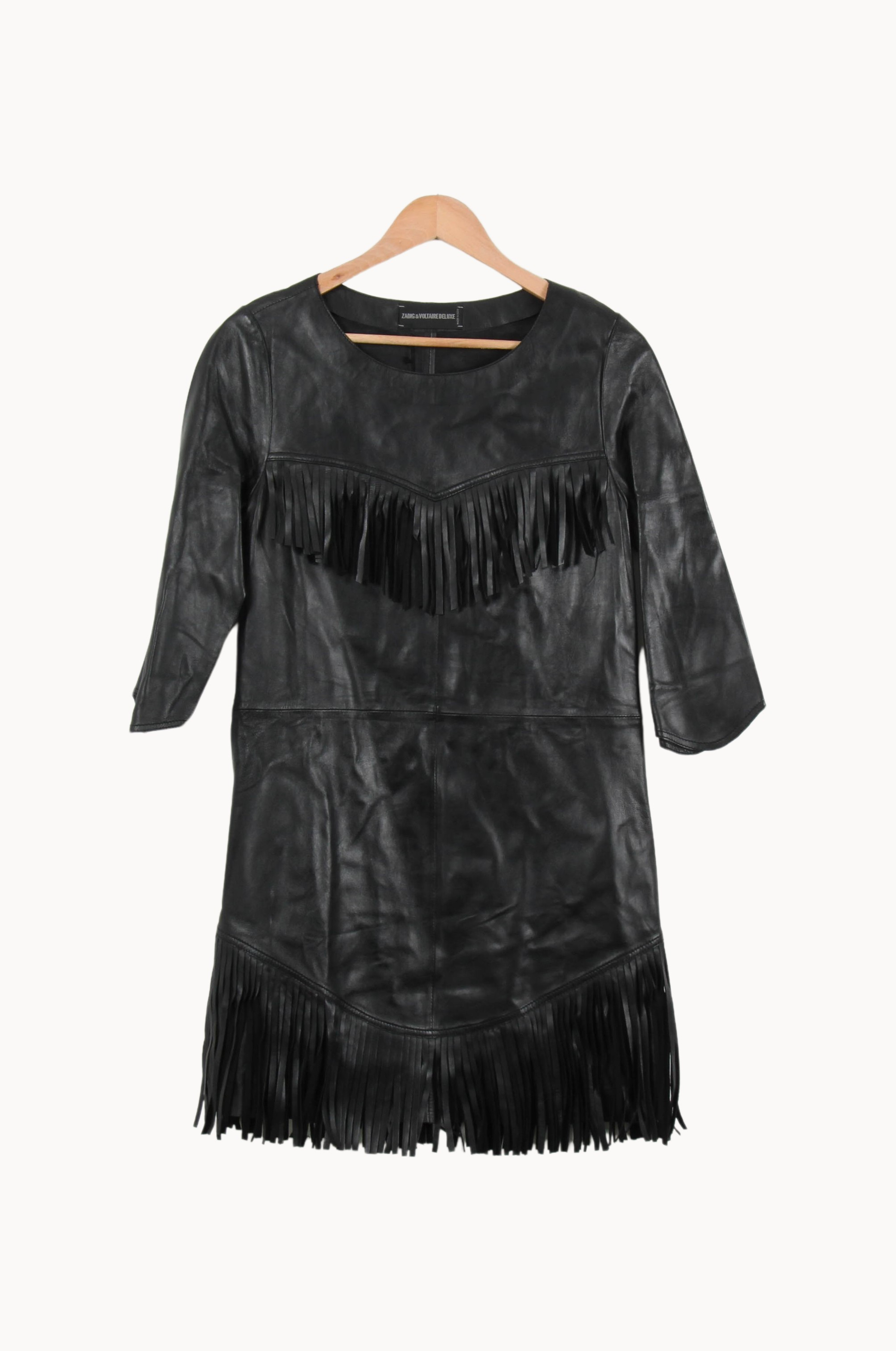 Robe en cuir noir à franges Zadig&Voltaire, taille S/36, élégante et audacieuse, idéale pour une allure rock chic. La matière en cuir véritable est sublimée par des franges appliquées sur la poitrine et le bas de la robe, apportant du mouvement et un caractère unique à ce modèle iconique. Parfaite pour une soirée tendance ou un événement où l’on souhaite affirmer son style.