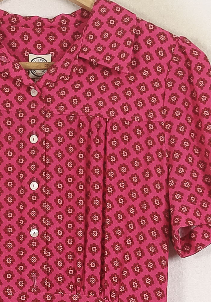 Robe midi rose à motif fleuri signée Ines de la Fressange Paris, taille S/36, alliant élégance intemporelle et raffinement. Confectionnée dans une matière fluide et légère, elle se distingue par ses détails de plis sur le buste, son col chemise délicat et sa rangée de boutons discrets, conférant une note rétro et féminine. Parfaite pour un déjeuner estival en terrasse ou une promenade citadine chic.