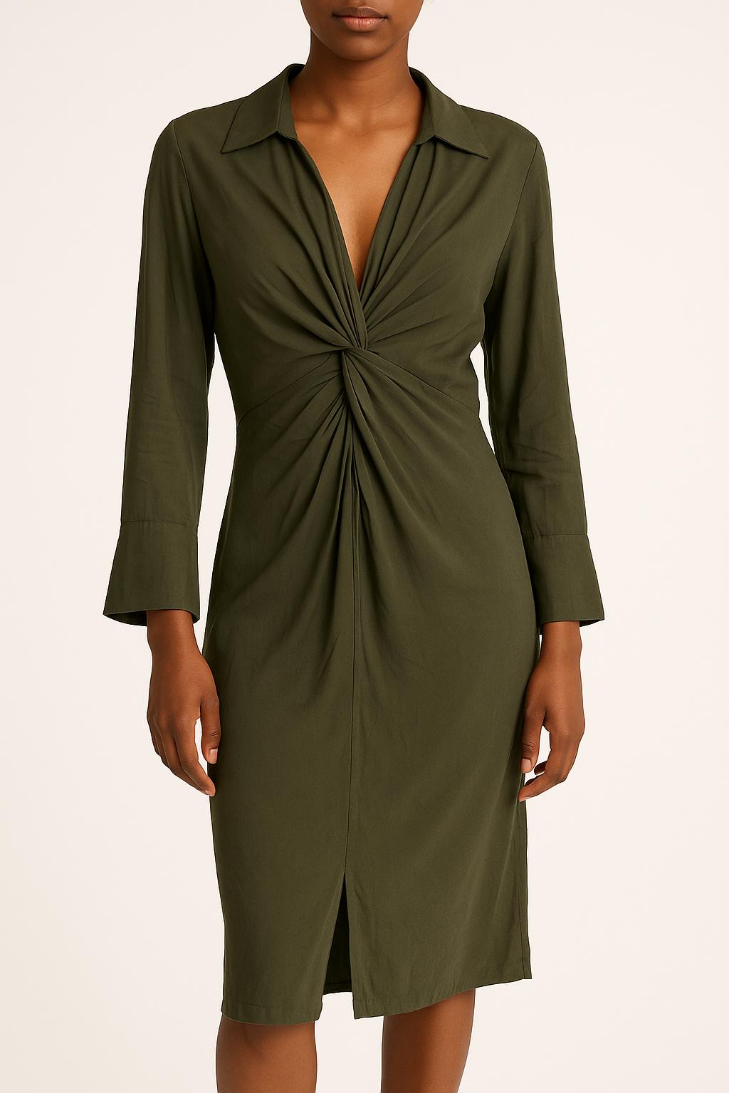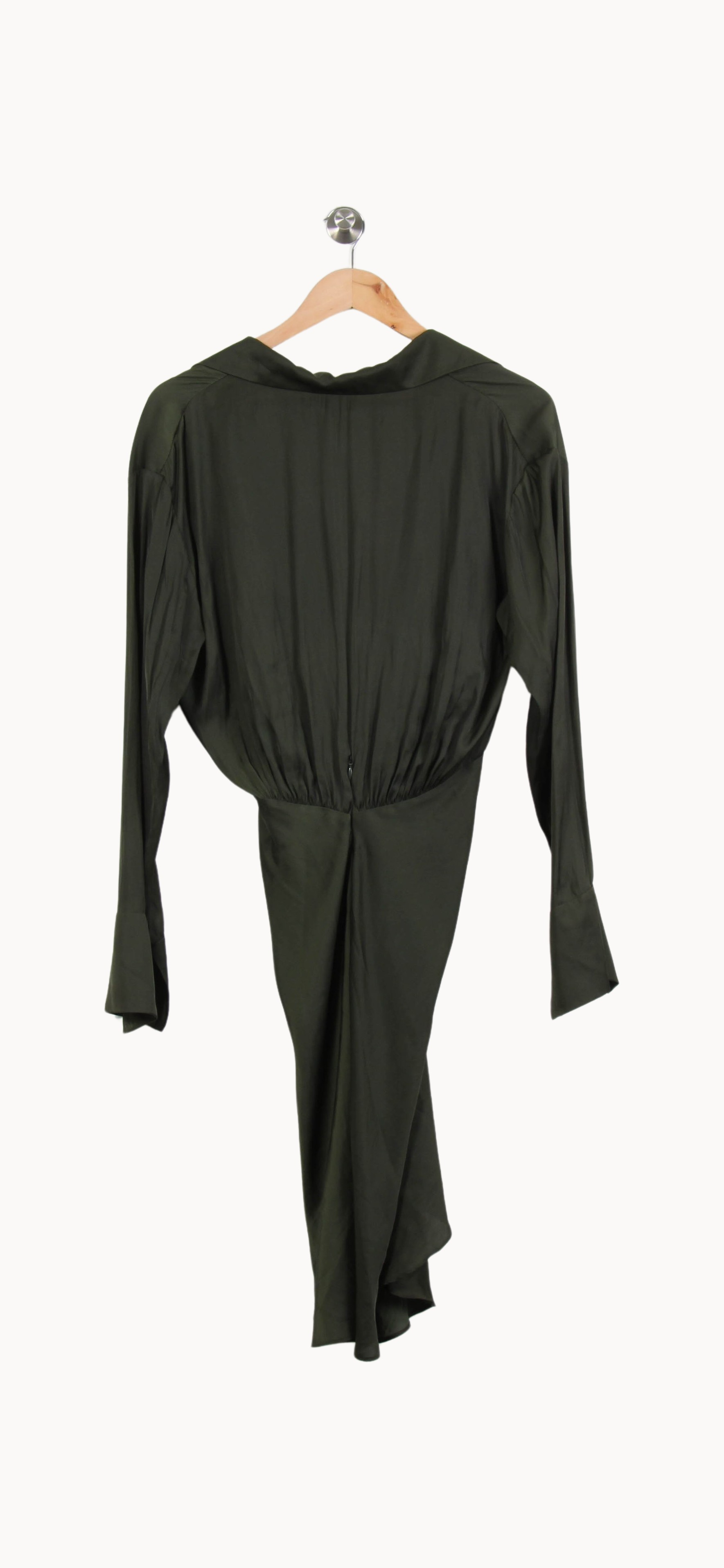Robe verte Zadig&Voltaire taille M/38, élégante avec son drapé central et son col à revers. Confectionnée dans une matière fluide à l’aspect satiné, elle se distingue par un nœud raffiné à la taille et des manches longues évasées, soulignant une allure à la fois moderne et sophistiquée. Idéale pour une soirée habillée ou un événement chic.