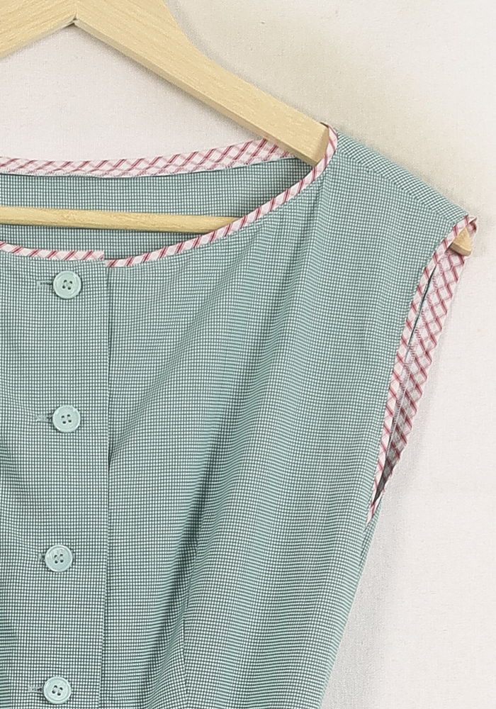 Robe verte sans manches, boutonnée sur le devant, ceinturée à la taille d’un ruban à carreaux roses, signée Ines de la Fressange Paris, taille S/36. Cette robe en tissu léger présente de délicats liserés contrastants au col et aux emmanchures, ainsi qu’une ceinture nouée qui souligne subtilement la silhouette, offrant une allure raffinée et féminine. Idéale pour une promenade estivale, un déjeuner en terrasse ou une réunion informelle où l'élégance naturelle est de mise.