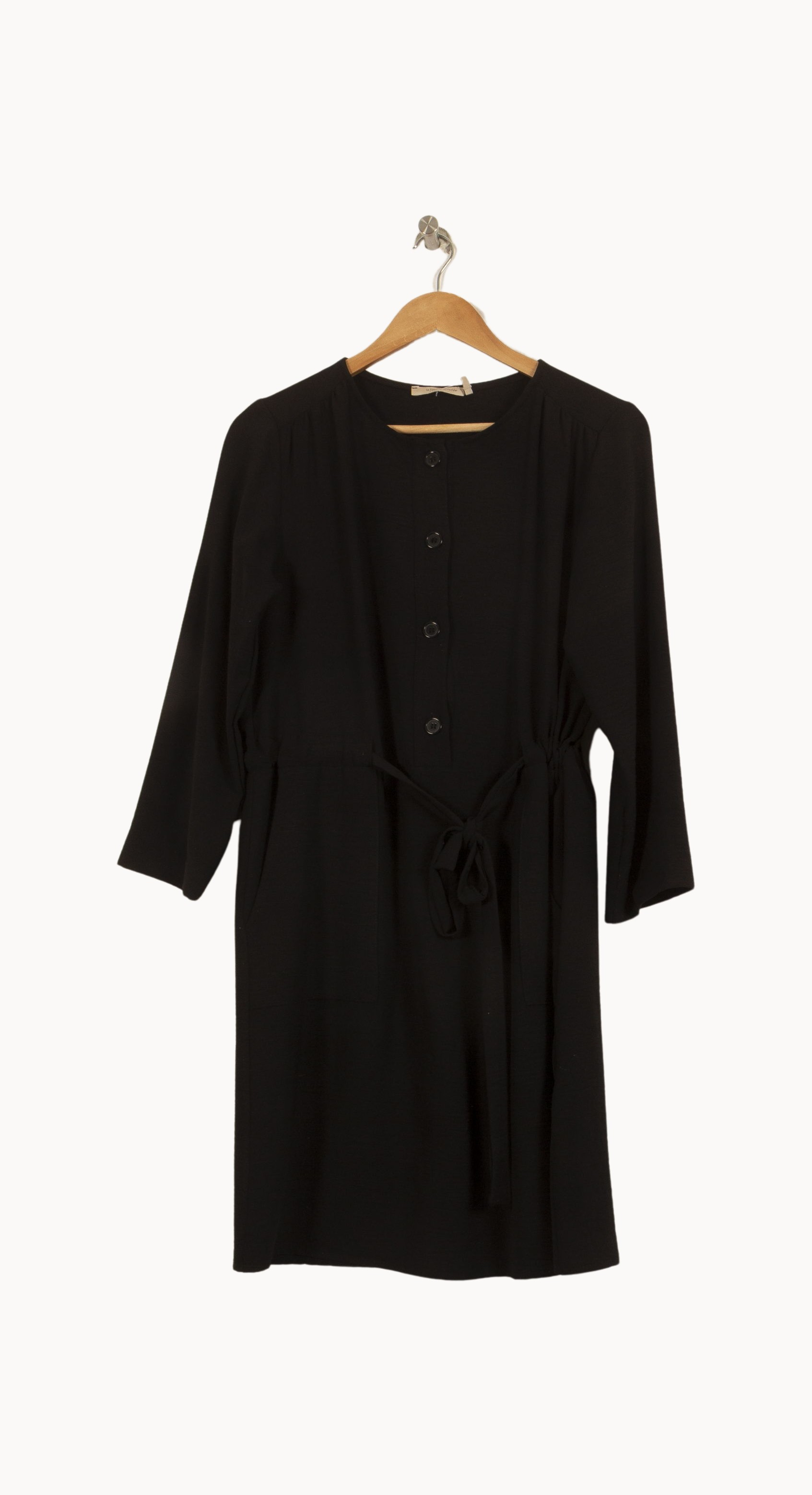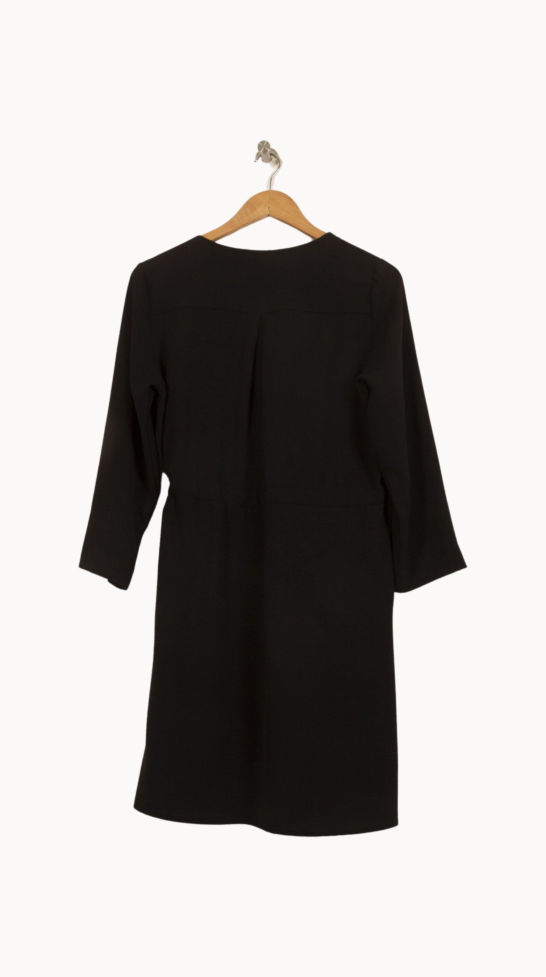 Robe noire La Fée Maraboutée, taille M/38, à manches longues et fermeture boutonnée sur le devant, soulignée par un lien à nouer à la taille. Sa matière fluide et légère apporte un confort optimal, tandis que les détails de fronces aux épaules et la ceinture apportent une touche de féminité et de structure, rendant ce modèle à la fois élégant et intemporel. Parfaite pour une journée de travail comme pour un dîner raffiné, elle s'adapte aussi bien aux occasions formelles qu'à un style décontracté.
