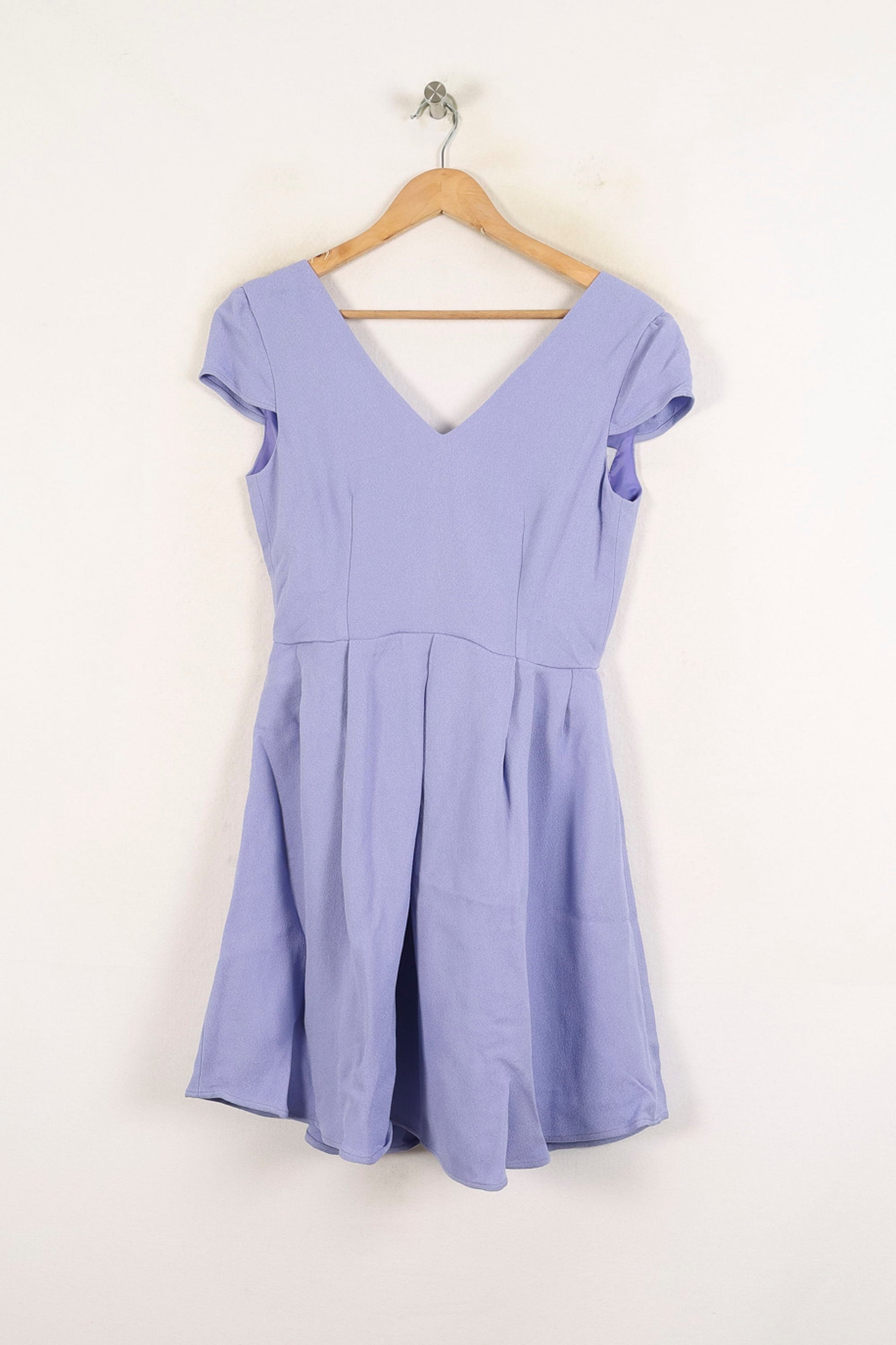 Robe courte violette Maison Lemoine, taille S/36, dotée d’un élégant col en V et de manches courtes. Confectionnée dans une matière fluide, elle se distingue par ses plis délicats sur la jupe, offrant un tombé raffiné et une silhouette féminine. Idéale pour assister à un cocktail ou une cérémonie estivale.