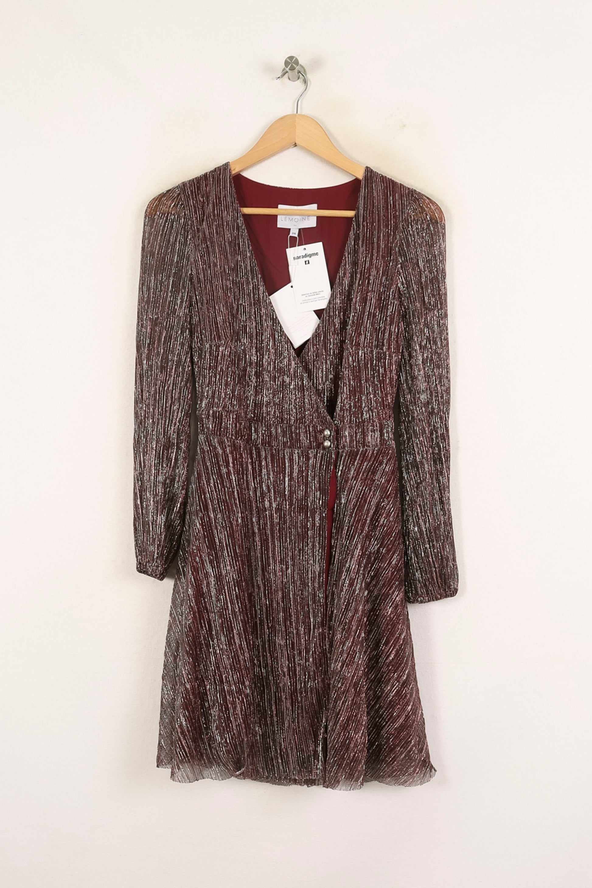 Robe Maison Lemoine, taille S/36, coloris bordeaux, à manches longues et en tissu plissé à reflets argentés, élégante et moderne. La matière délicatement plissée, ornée de subtils reflets métallisés, confère à cette robe une allure unique et sophistiquée, tandis que le col en V et la fermeture à bouton bijou soulignent la finesse de sa confection. Idéale pour une soirée élégante ou un événement festif, elle saura attirer tous les regards avec raffinement.