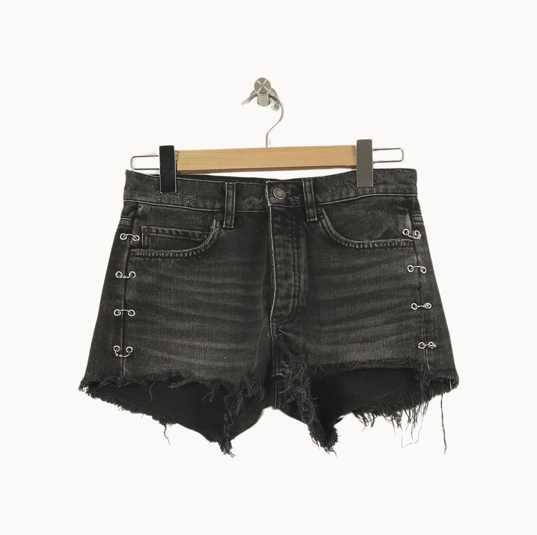Short et jean noir The Kooples, taille S/36, avec détails métalliques sur les côtés. Confectionné en denim effet délavé et orné de finitions soignées, ce short se distingue par ses empiècements métalliques crochetés, qui lui confèrent une touche de modernité et d'audace. Idéal pour une virée en festival en plein air.
