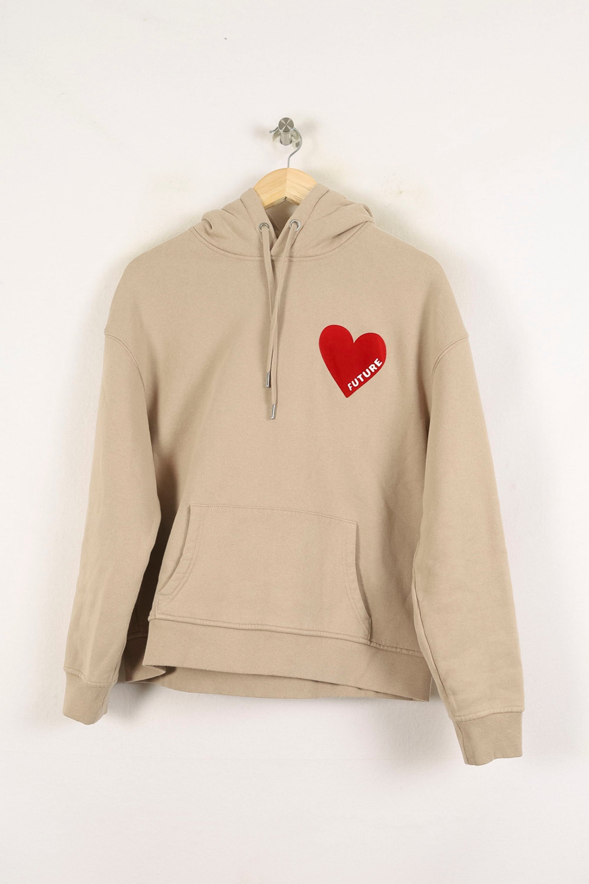 Sweat à capuche beige de Future taille S/36, avec un motif rouge et l'inscription « FUTURE » en arrière-plan. Le processus de finition est réalisé avec le kangourou et les touches finales, mais le dessin du motif original rend la coupe confortable. Parfait pour un look décontracté lors de votre week-end de détente.