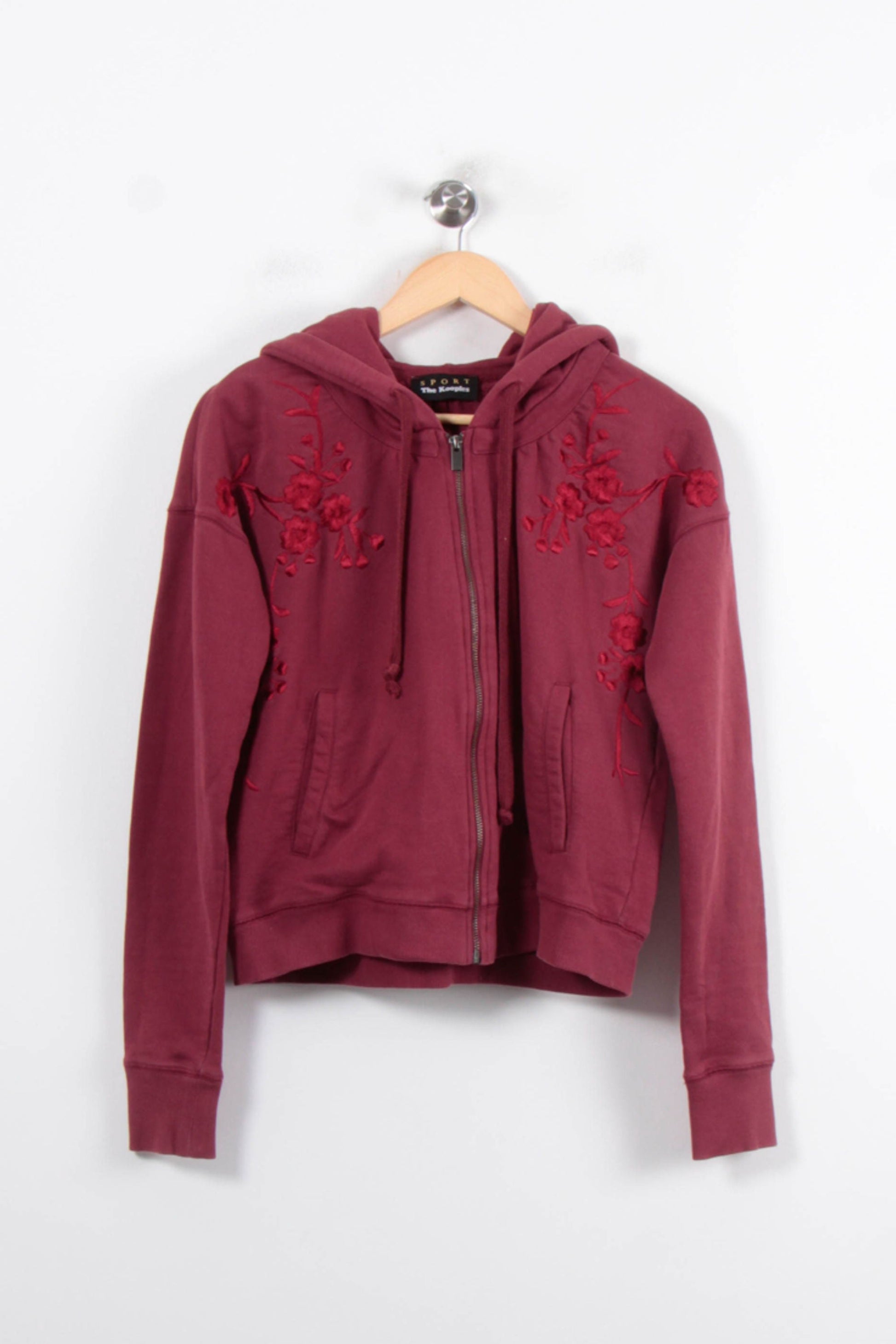 Sweat à capuche bordeaux The Kooples - Sport, taille XXS/32, orné de broderies florales ton sur ton sur le devant, fermeture zippée et poches latérales. Confectionné dans une matière agréable, ce modèle se distingue par ses détails brodés raffinés qui apportent une touche de caractère et d’élégance à un vêtement sportswear. Parfait pour une tenue décontractée et sophistiquée lors d’une sortie en ville ou d’un week-end détente.