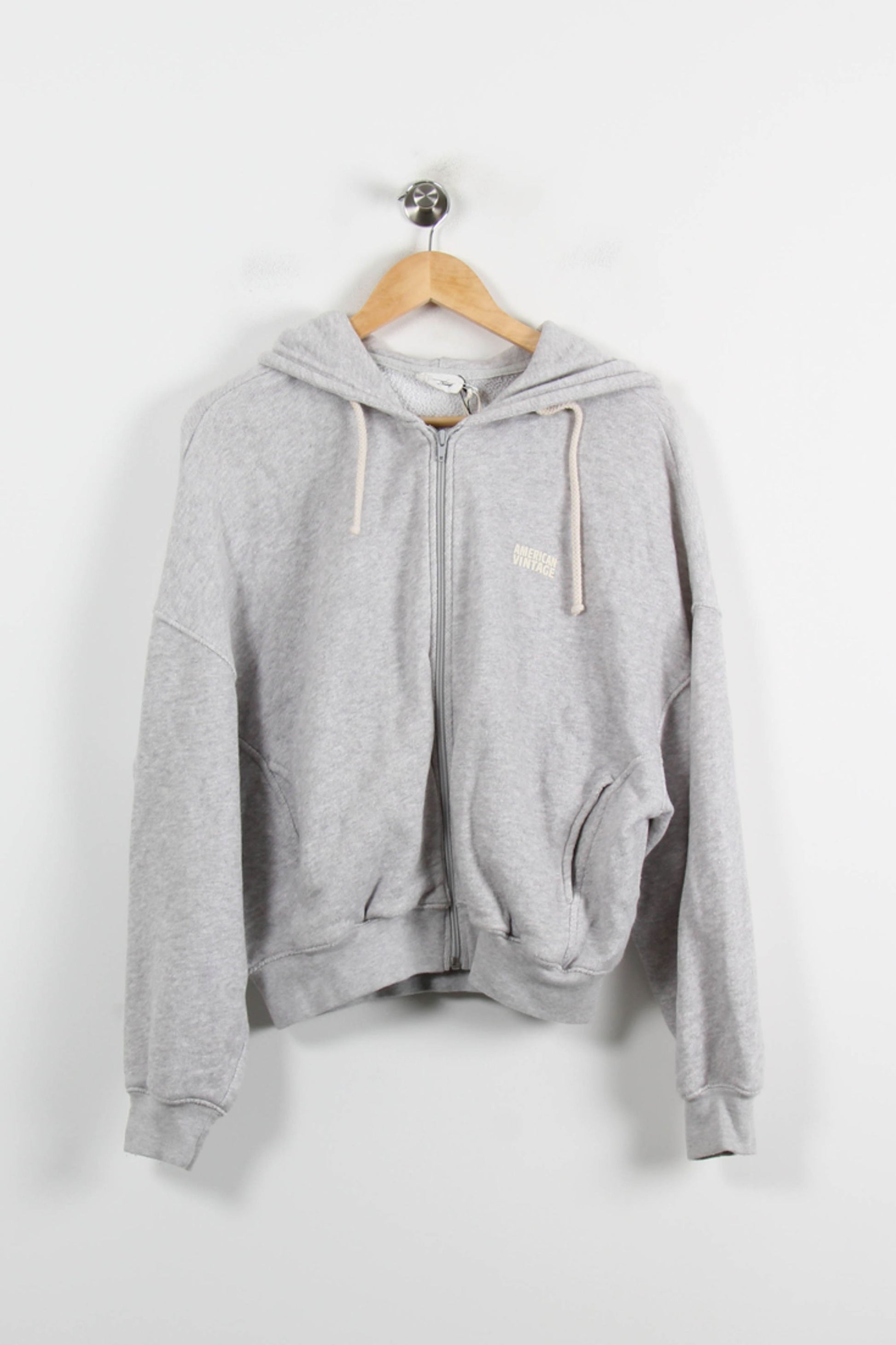 Sweat-shirt zippé gris American Vintage, taille XS/34, idéal pour un look décontracté et confortable. La préparation d'une matière douce et moelleuse, le modèle est réalisé avec une coupe oversize, les treillis sont pratiques, les cordons de beiges verts et l'inscription discrète de la marque sur la poitrine, conviennent pour une touche moderne et contemporaine. Parfait pour vous journées détente, une balade en ville ou pour superposer lors de vos voyages.