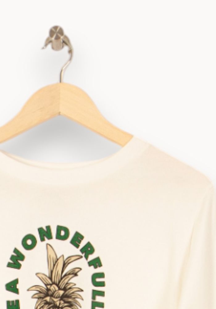 Pull blanc imprimé "HAVE A WONDERFULL DAY" par Imprevu, taille XS/34, coupe et confort, idéal pour un style décontracté. La production d'un matériau qui se distingue par le motif original de l'ananas utilisé dans les lunettes, associé à un message positif, la signature de la marque Imprevus, et la touche de l'original et l'ambiance originale. Pour régler le contrat en cours de semaine ou pour apporter une touche dynamique à une équipe de citadine.
