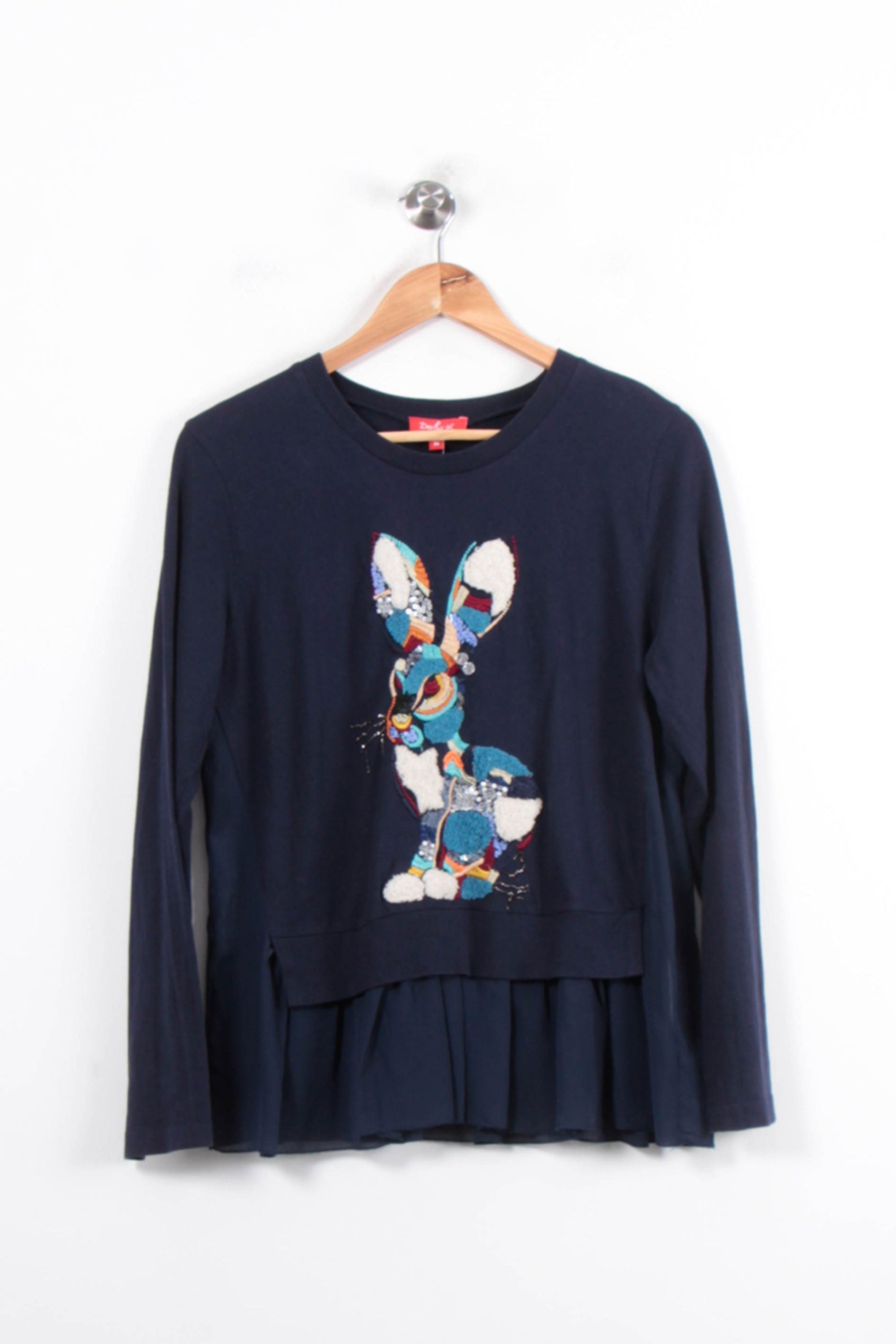Top bleu Derhy taille M/38, orné d'un motif lapin coloré brodé sur le devant. La finition d'un matériau au toucher doux et fluide, rehaussée d'appliqués et de reliefs multicolores et d'une base à effet plissé, apporte une touche d'imagination et d'originalité à la pièce. Particulièrement pour un contrat de tri ou un brunch entre amis, ajoutant une note de plaisir à une tenue très élégante.