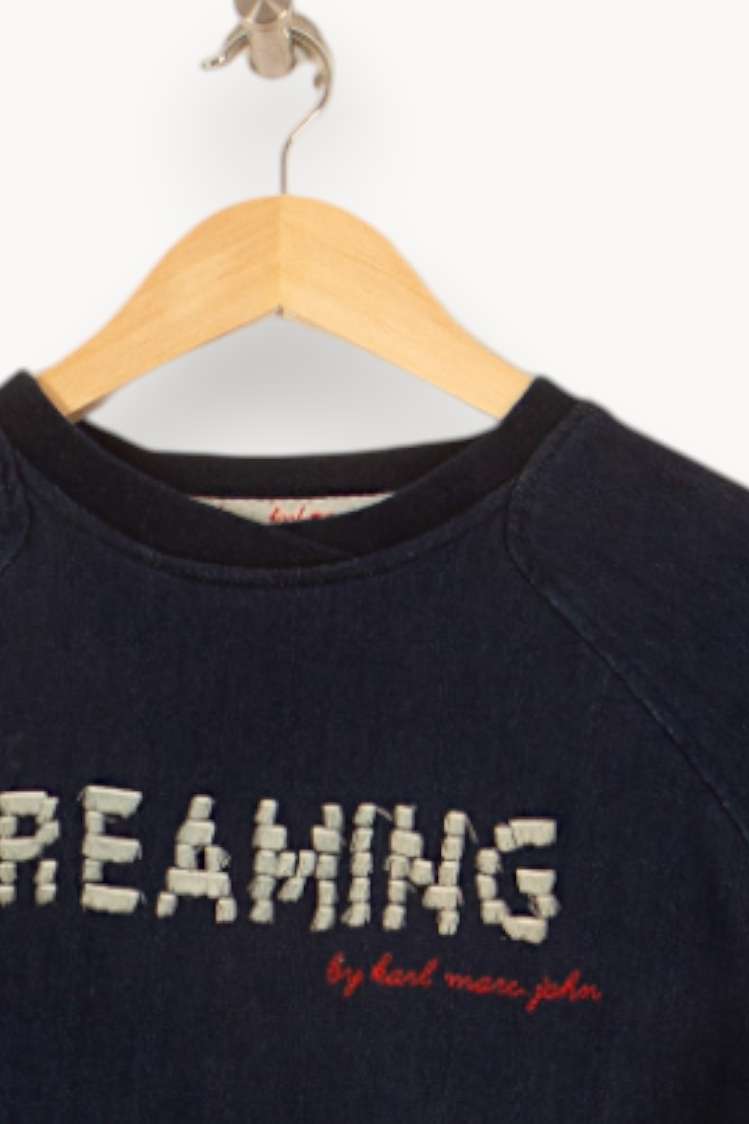 Sweatshirt bleu "Dreaming" Karl Marc John, taille S/36, arborant une coupe moderne et confortable. Confectionné dans une matière qui semble douce au toucher, ce pull se distingue par son inscription "DREAMING" en relief et la signature brodée discrète, apportant une touche d’originalité et d’élégance à la pièce. Idéal pour une sortie décontractée ou un moment cocooning à la maison.