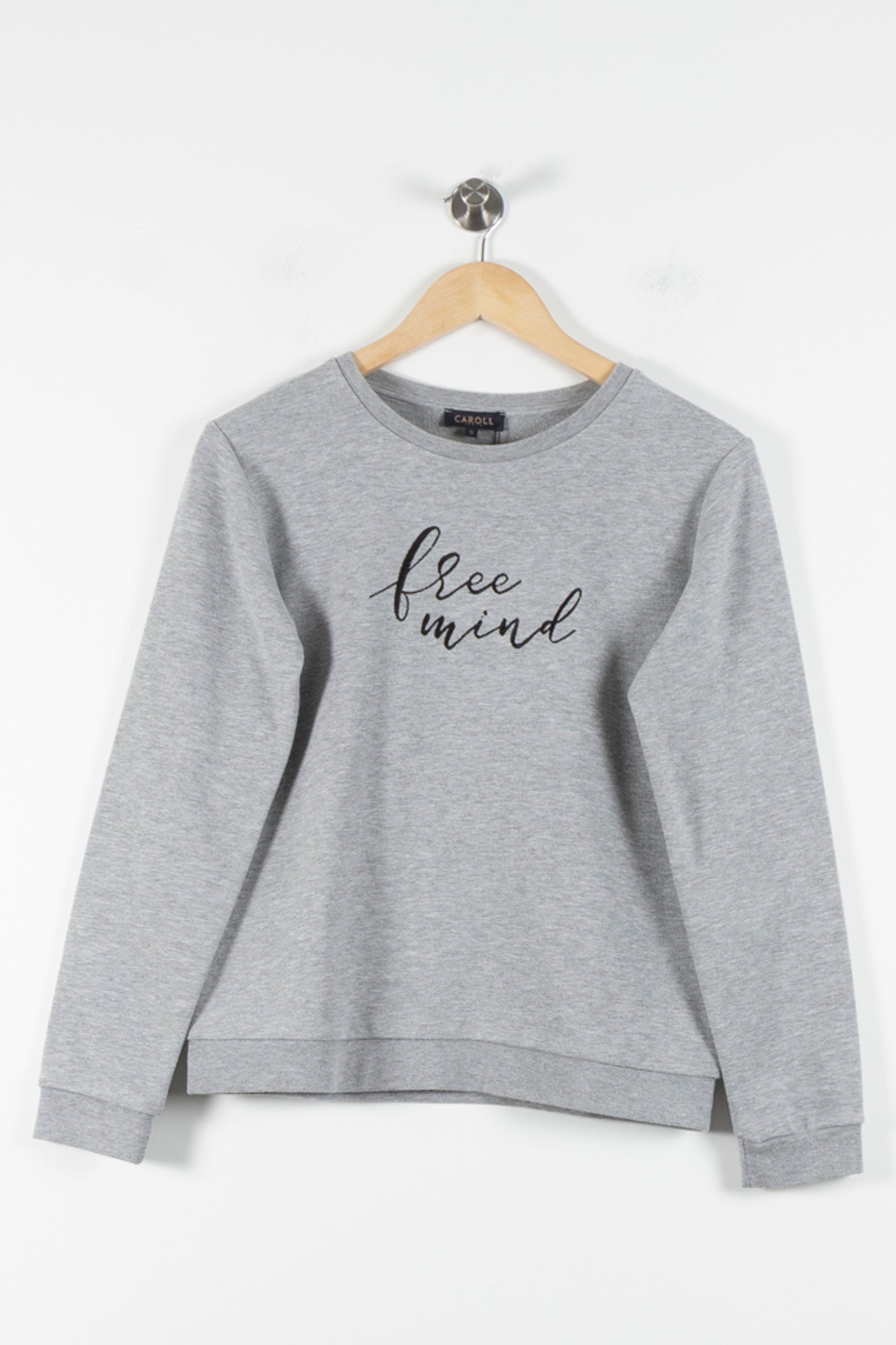 Sweatshirt gris "Free Mind" Caroll, taille S/36, à la coupe droite et épurée. Confectionné dans un mélange doux de coton (60%) et polyester (40%) avec une garniture discrète, ce pull se distingue par son inscription stylisée sur le devant qui lui confère une touche moderne et raffinée. Idéal pour une journée décontractée ou un moment de détente entre amis.