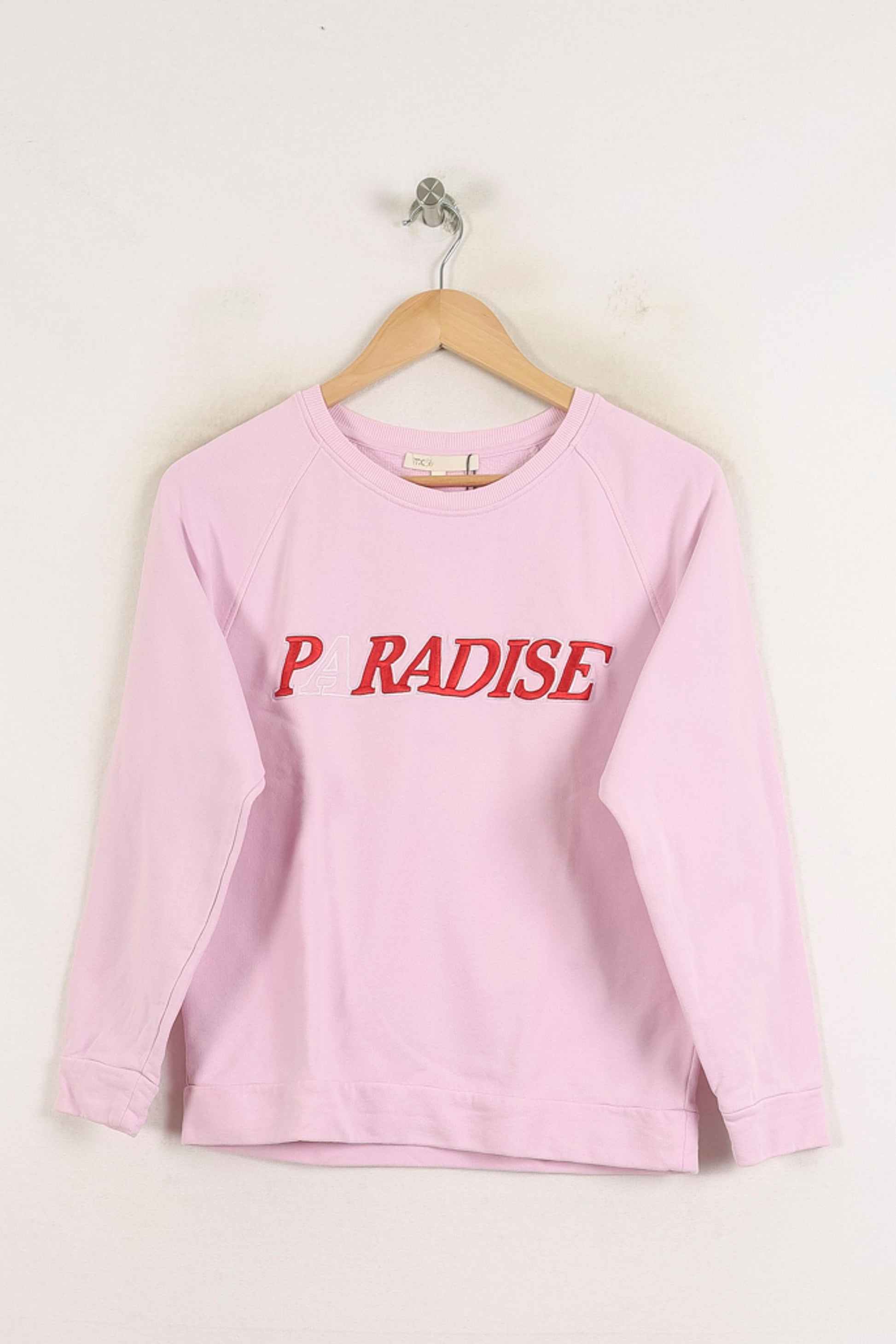Sweat-shirt "PARADISE" rose, taille S/36, de la marque Maje. Confectionné dans une matière aux finitions soignées, ce modèle se distingue par une coupe élégante et l'inscription « PARADISE » en relief rouge et blanc sur le devant, pour une touche de modernité et d'affirmation. Idéal pour une promenade citadine ou pour un look chic et décontracté lors d'un brunch.