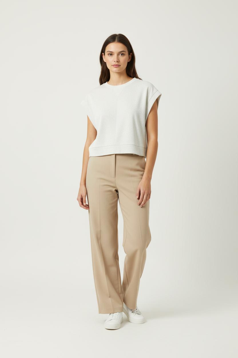 Top beige sans manches La Fée Maraboutée, taille XS/34, à la coupe légèrement boxy et à l’encolure ronde. Confectionné dans un mélange de coton (84%), polyester (14%) et polyamide (2%), ce top se distingue par sa texture subtilement chinée et ses finitions soignées au col et à la base, mettant en valeur la simplicité élégante de la pièce. Idéal pour un look casual chic lors d’un déjeuner entre amis ou pour une tenue estivale épurée.