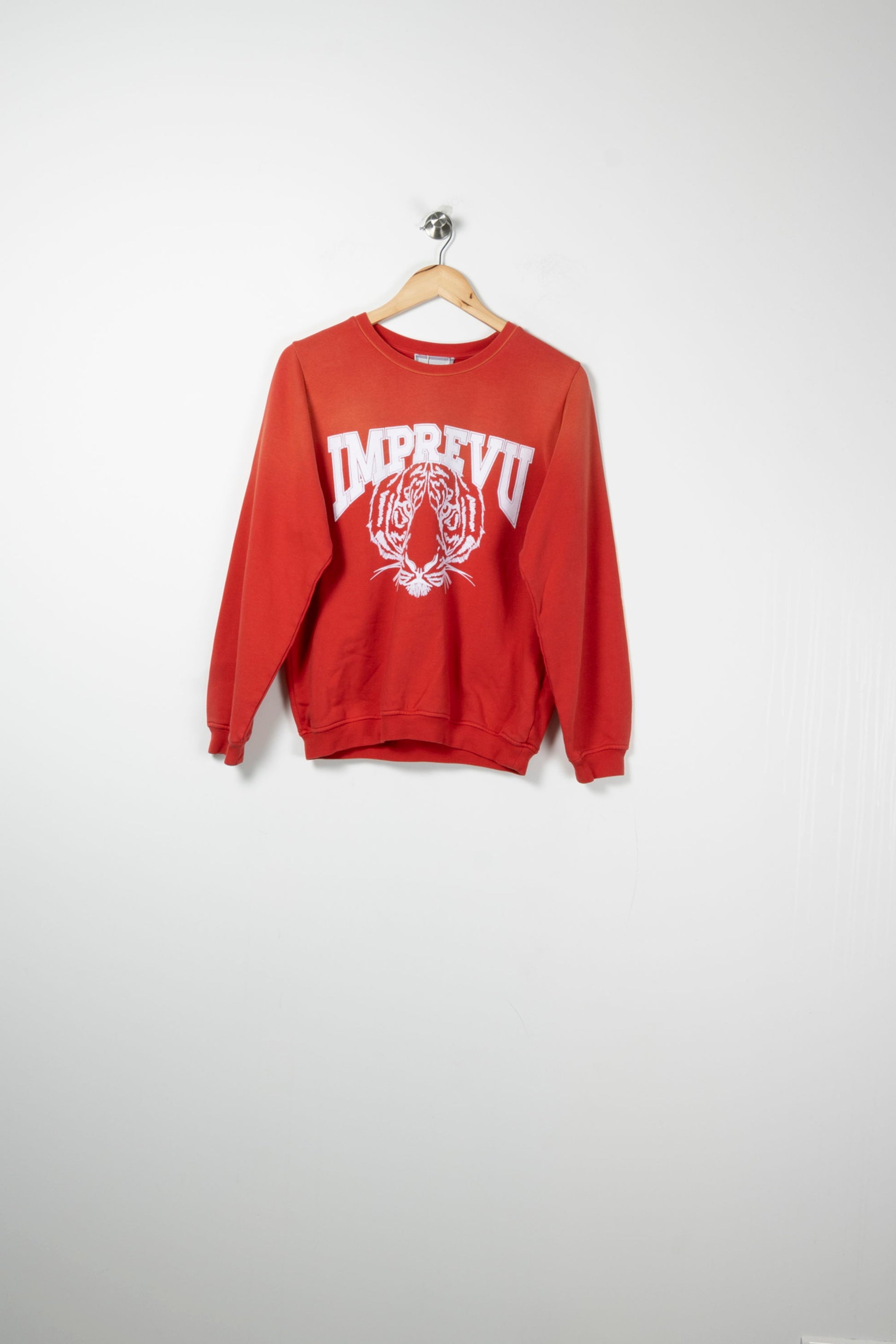 Sweatshirt rouge "IMPREVU" taille XS/34 signé Imprevu, arborant un dessin et un graphisme sur le devant. La nature du produit est non spécifique, avec un charme décontracté, et les finitions des couleurs et le motif du style offrent une touche moderne et distinctive. Idéal pour un contrat de tri ou pour dynamiser une garde-robe et lui donner une pièce forte et originale.