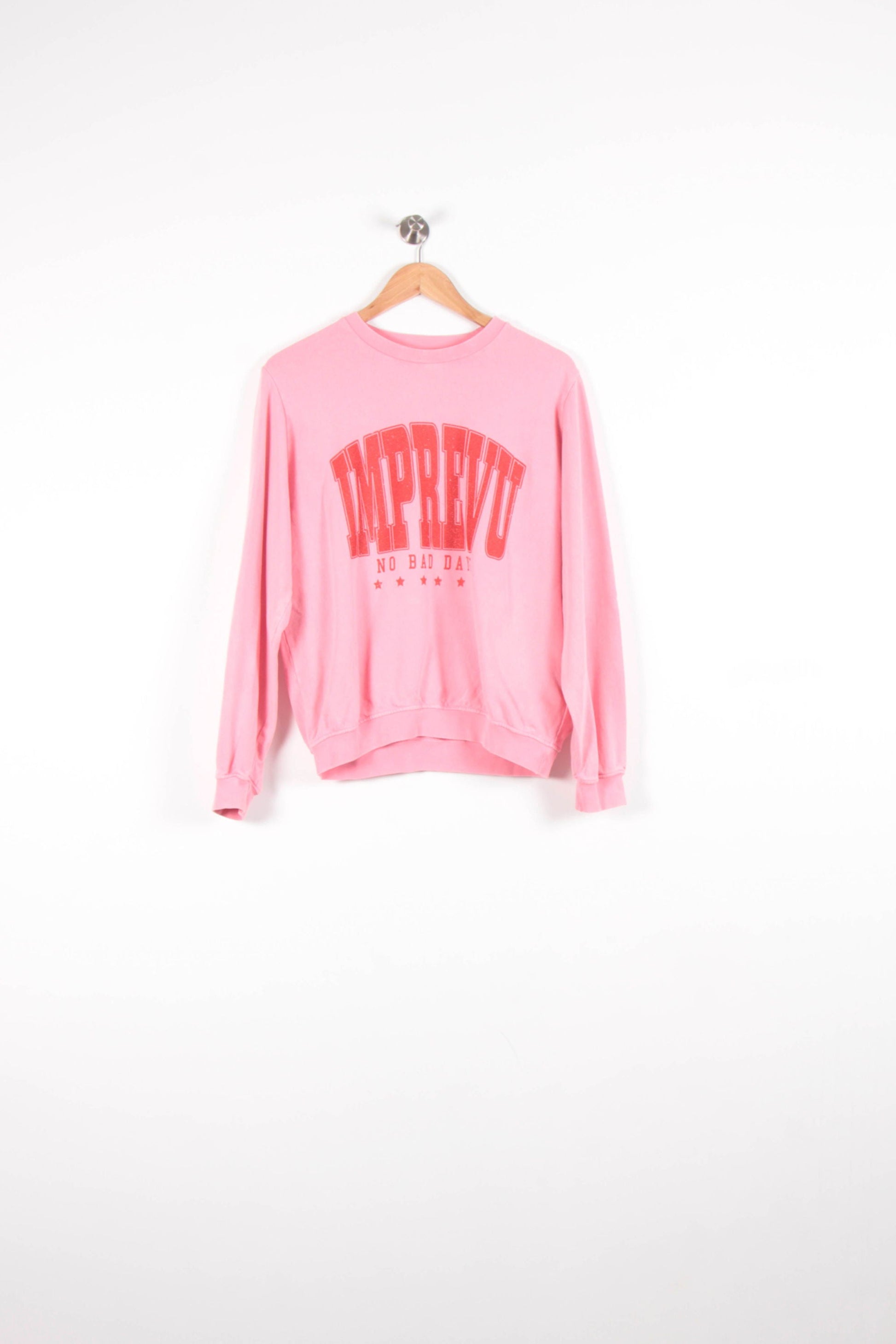 Pull rose "IMPREVU NO BAD DAY", taille XS/34, de la marque Imprevu. Le tissu est conçu pour être confortable et agréable à porter, avec un imprimé et un relief distinctifs sur le motif ; il apporte une touche de modernité et d'affirmation à la tenue. Idéal pour un séjour de week-end ou une promenade en ville en journée.