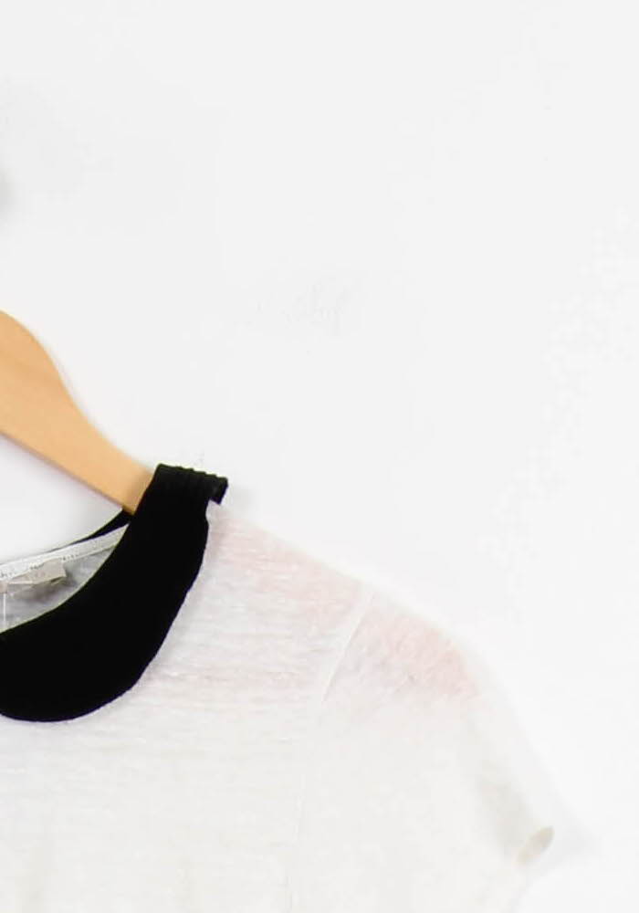 Top blanc à col claudine noir Pablo, taille S/36. Confectionné dans une matière légère, ce top se distingue par son col claudine contrastant qui apporte une touche élégante et rétro à la silhouette. Parfait pour une journée au bureau ou un déjeuner en ville, il saura sublimer un look casual chic.