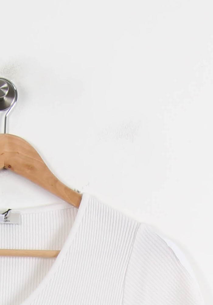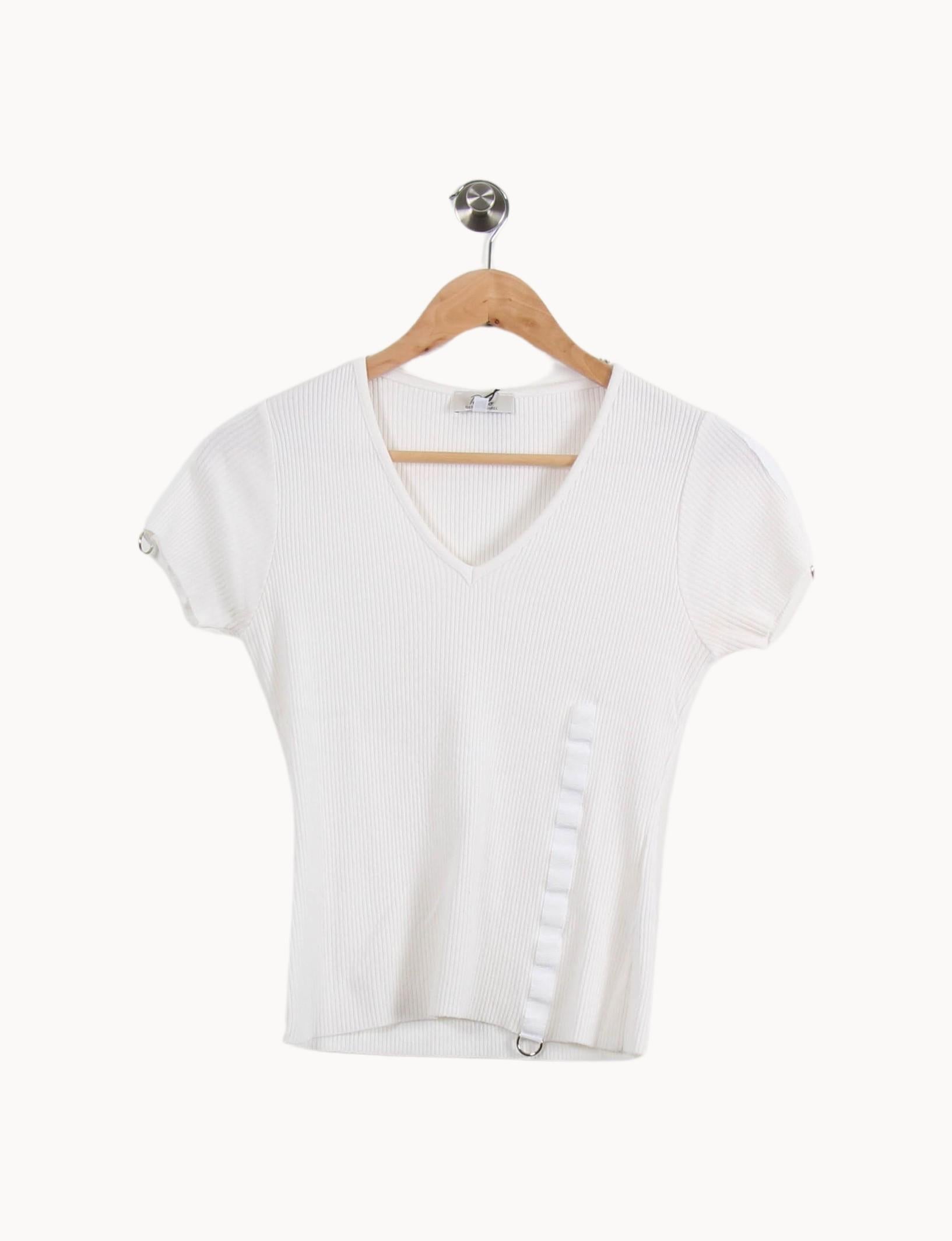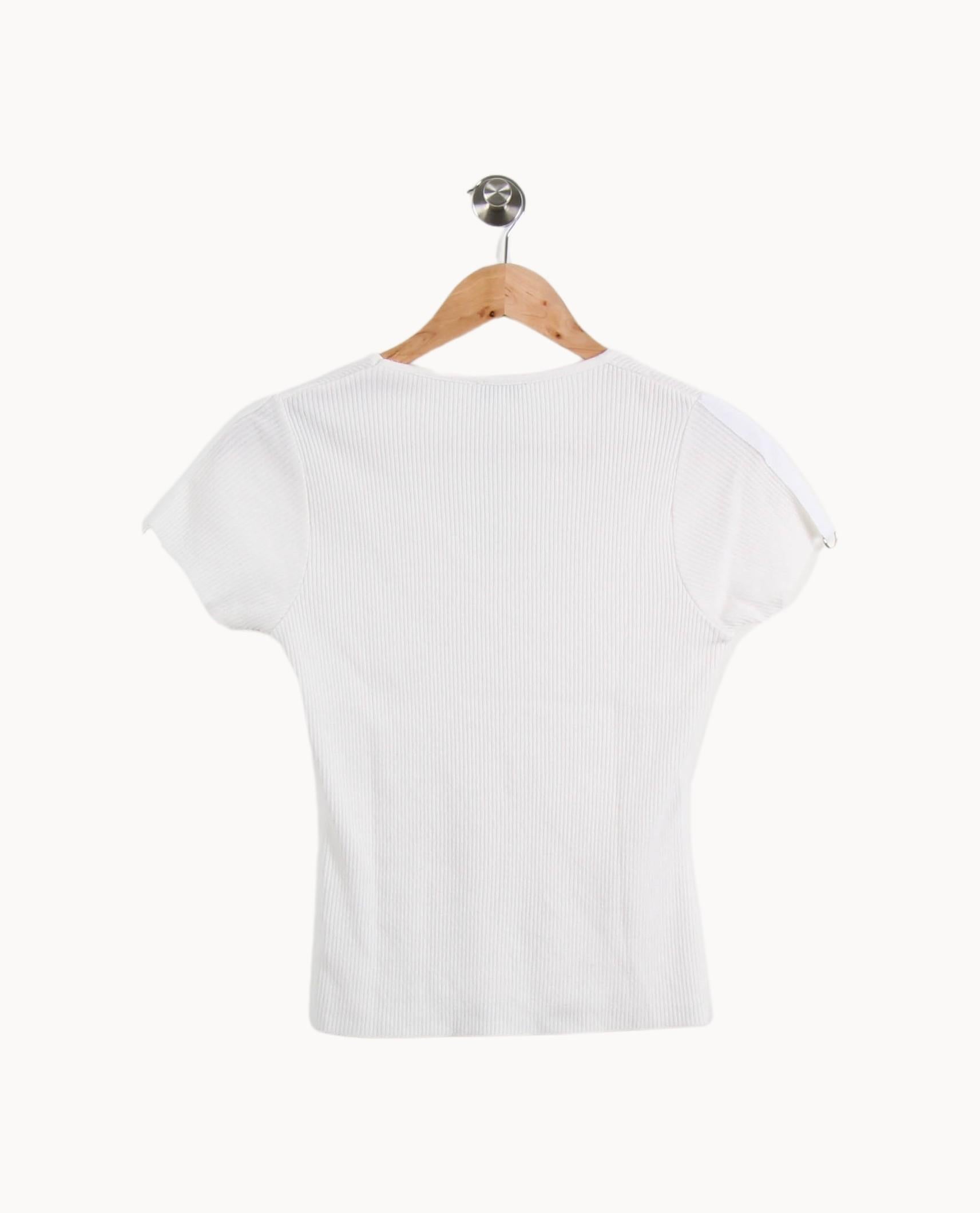 Top blanc à manches courtes, en taille M/38 de la marque Gerard Darel, doté d'un élégant col V et d'une finition raffinée. La production d'un matériau côtelé, avec le plus grand soin apporté aux détails, unique dans ses détails, sans oublier la décoration verticale de la ferronnerie, avec une touche contemporaine. Idéal pour un développement professionnel à long terme ou un contrat de jeune en ville.