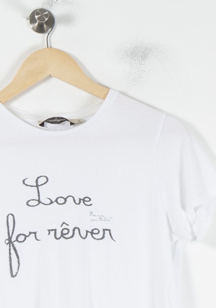 T-shirt blanc "Love for rêver" de La Fée Maraboutée, taille M/38. Confectionné en 100% coton, ce top séduit par sa douceur et son inscription contrastée sur le devant, qui lui confère une touche poétique et délicate. Parfait pour une journée décontractée en ville ou un moment convivial entre amis.