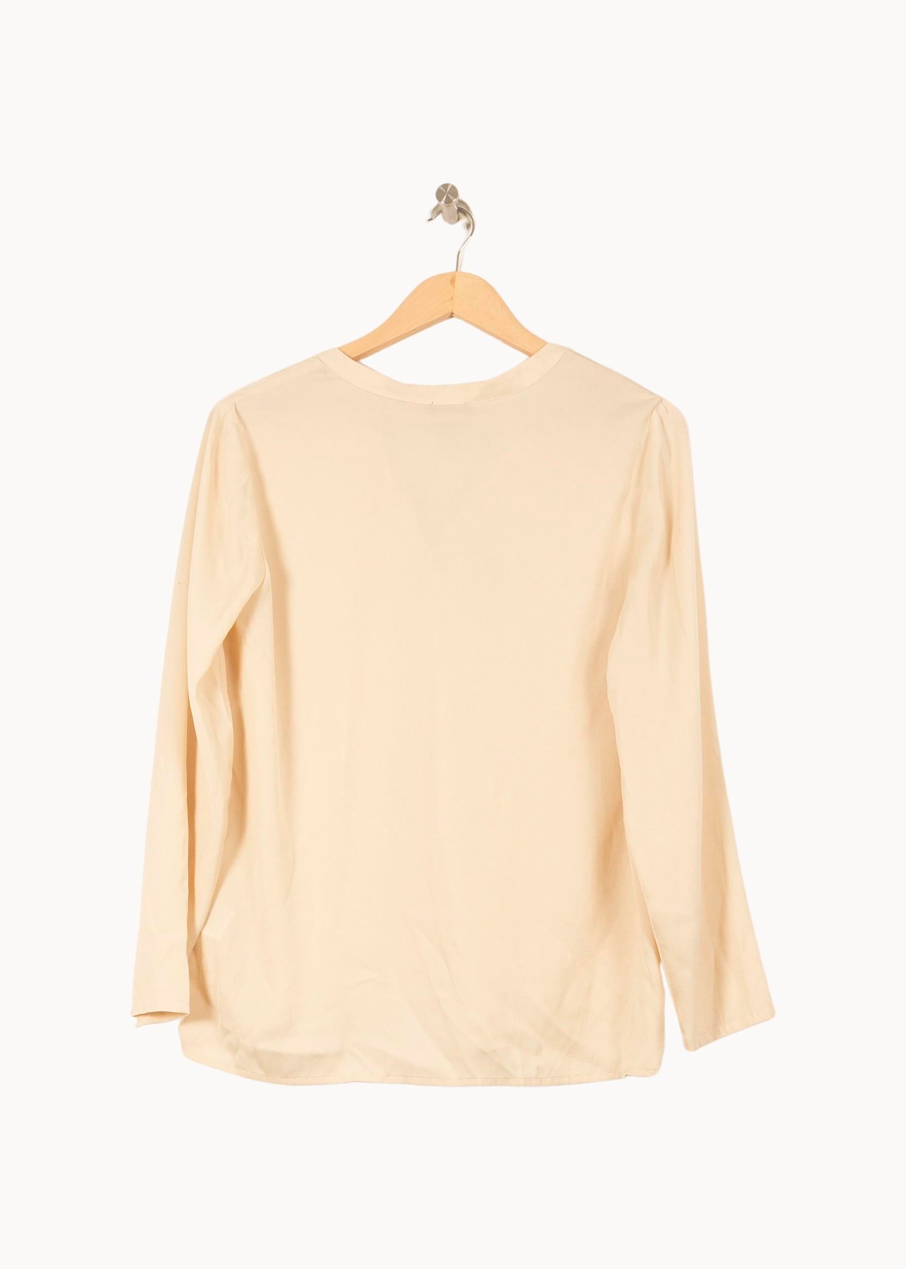 Top beige à manches longues Bérénice, taille S/36, élégant et raffiné, idéal pour une garde-robe sophistiquée. Confectionnée dans une matière fluide, la surface se distingue par sa douceur et sa délicatesse, offrant un revêtement impeccable et un toucher agréable. Parfait pour une journée de travail avec un pantalon ajusté à votre tenue ou une tenue décontractée chic lorsque vous êtes jeune.