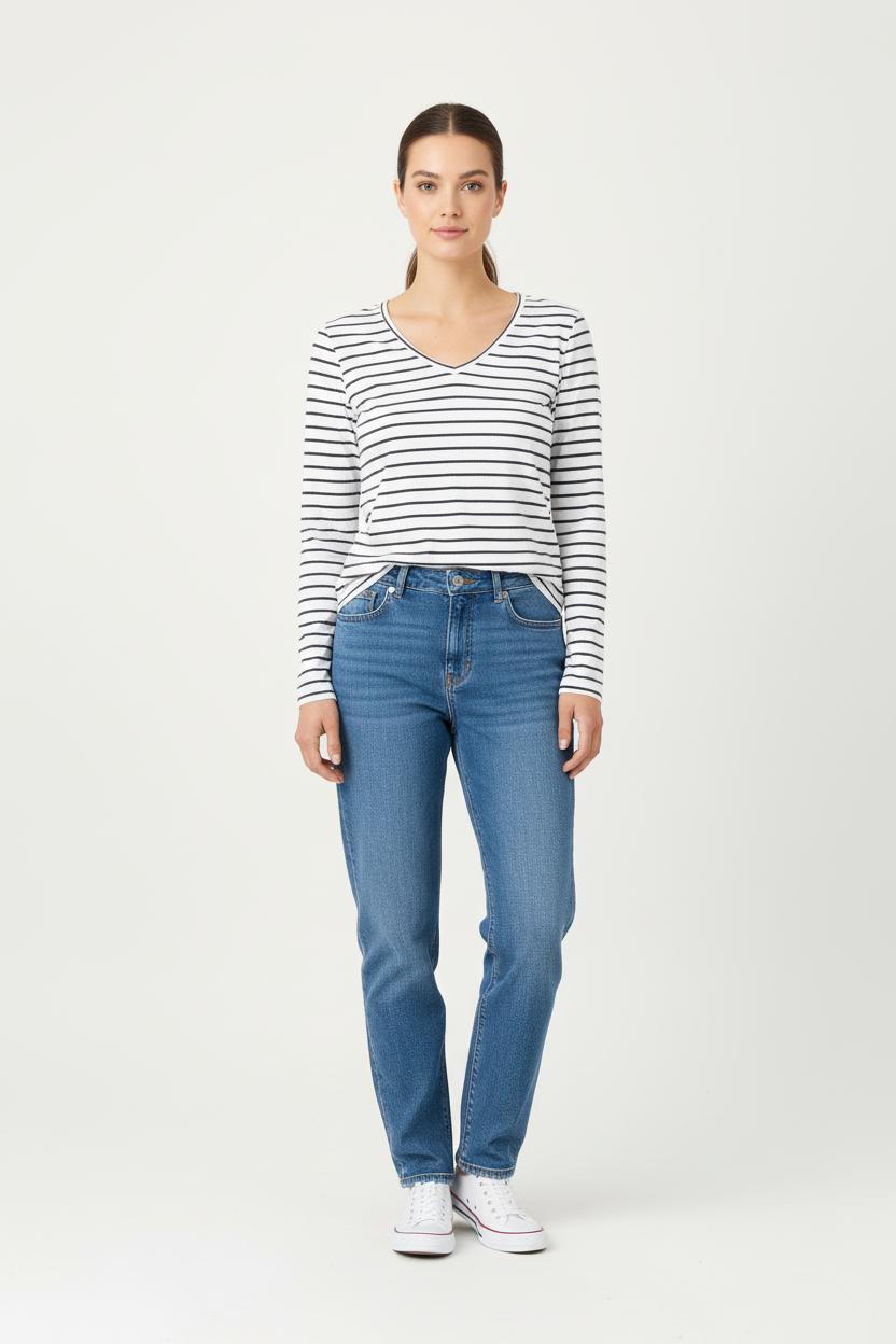 Top multicolore IKKS, taille S/36, à manches longues, parfait pour une silhouette décontractée et élégante. Confectionné dans une matière légère et agréable, ce top se distingue par son col en V et ses fines rayures contrastées qui nous confèrent un style intemporel et raffiné. Idéal pour une citadine au quotidien, à associer à un jean ou à un look jeune pour une allure chic et structurée.
