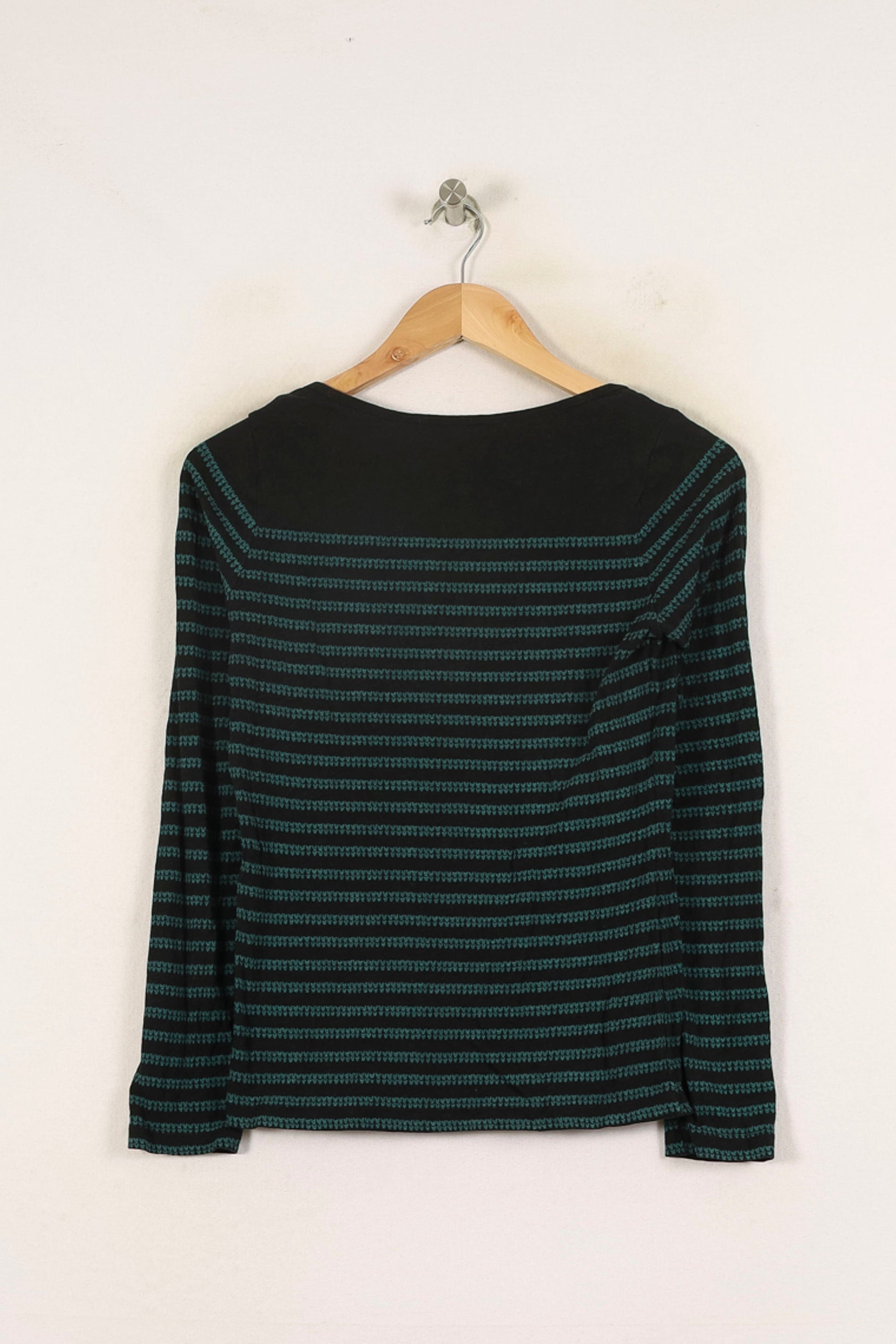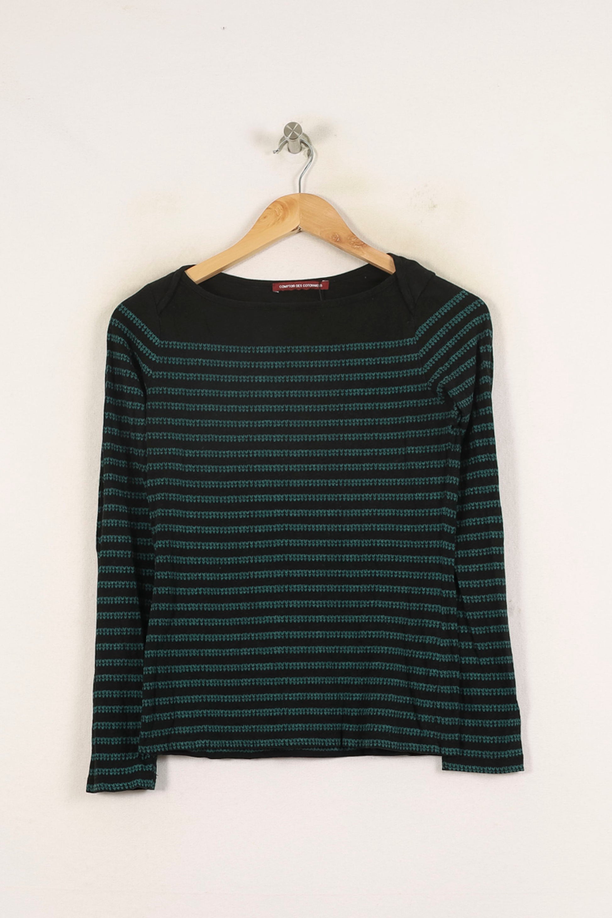 Top rayé noir et vert Comptoir des Cotonniers, taille XS/34, alliant élégance et subtilité avec sa coupe classique à manches longues. Confectionné dans une matière douce, ce top se distingue par un motif rayé délicat et un empiècement uni au niveau des épaules, apportant une touche moderne et raffinée. Idéal pour une journée élégante au bureau, associé à un pantalon ou une jupe.